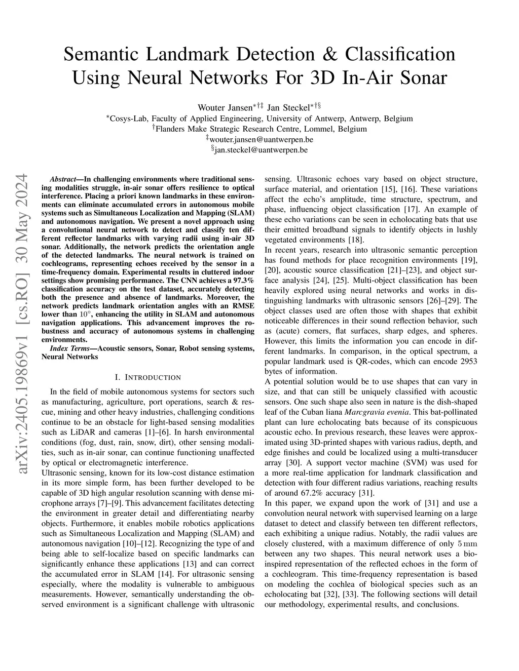 In challenging environments where traditional sensing modalities struggle, in-air sonar offers resilience to optical interference. Placing a priori known landmarks in these environments can eliminate accumulated errors in autonomous mobile systems such as Simultaneous Localization and Mapping (SLAM) and autonomous navigation. We present a novel approach using a convolutional neural network to detect and classify ten different reflector landmarks with varying radii using in-air 3D sonar. Additionally, the network predicts the orientation angle of the detected landmarks. The neural network is trained on cochleograms, representing echoes received by the sensor in a time-frequency domain. Experimental results in cluttered indoor settings show promising performance. The CNN achieves a 97.3% classification accuracy on the test dataset, accurately detecting both the presence and absence of landmarks. Moreover, the network predicts landmark orientation angles with an RMSE lower than 10 degrees, enhancing the utility in SLAM and autonomous navigation applications. This advancement improves the robustness and accuracy of autonomous systems in challenging environments.