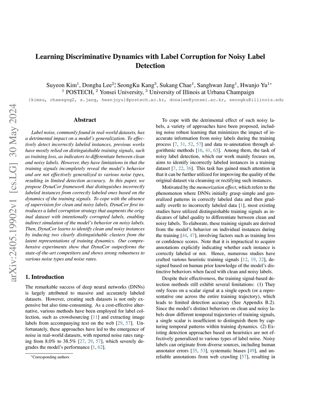 Label noise, commonly found in real-world datasets, has a detrimental impact on a model's generalization. To effectively detect incorrectly labeled instances, previous works have mostly relied on distinguishable training signals, such as training loss, as indicators to differentiate between clean and noisy labels. However, they have limitations in that the training signals incompletely reveal the model's behavior and are not effectively generalized to various noise types, resulting in limited detection accuracy. In this paper, we propose DynaCor framework that distinguishes incorrectly labeled instances from correctly labeled ones based on the dynamics of the training signals. To cope with the absence of supervision for clean and noisy labels, DynaCor first introduces a label corruption strategy that augments the original dataset with intentionally corrupted labels, enabling indirect simulation of the model's behavior on noisy labels. Then, DynaCor learns to identify clean and noisy instances by inducing two clearly distinguishable clusters from the latent representations of training dynamics. Our comprehensive experiments show that DynaCor outperforms the state-of-the-art competitors and shows strong robustness to various noise types and noise rates.