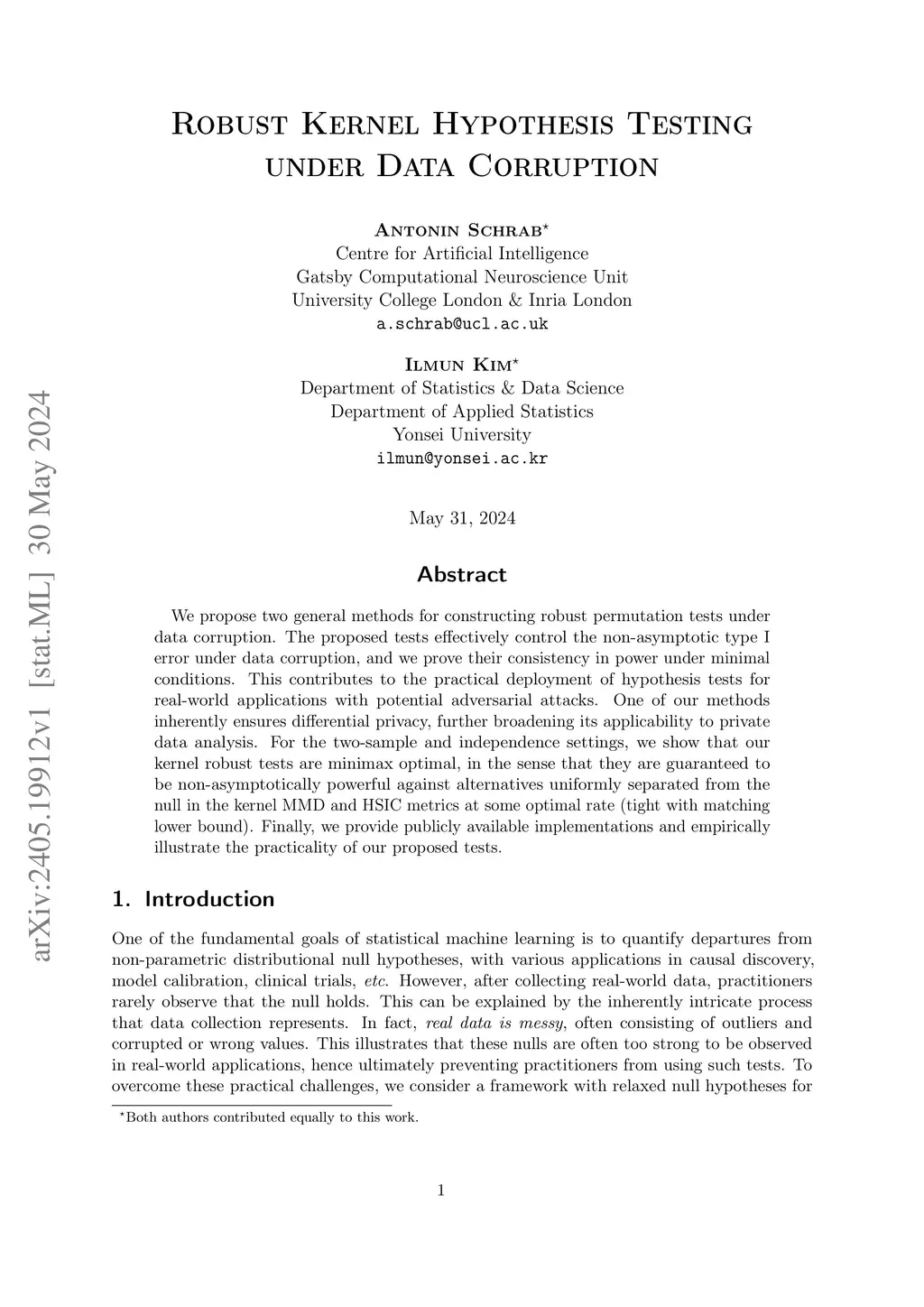 We propose a general method for constructing robust permutation tests under data corruption. The proposed tests effectively control the non-asymptotic type I error under data corruption, and we prove their consistency in power under minimal conditions. This contributes to the practical deployment of hypothesis tests for real-world applications with potential adversarial attacks. For the two-sample and independence settings, we show that our kernel robust tests are minimax optimal, in the sense that they are guaranteed to be non-asymptotically powerful against alternatives uniformly separated from the null in the kernel MMD and HSIC metrics at some optimal rate (tight with matching lower bound). We point out that existing differentially private tests can be adapted to be robust to data corruption, and we demonstrate in experiments that our proposed tests achieve much higher power than these private tests. Finally, we provide publicly available implementations and empirically illustrate the practicality of our robust tests.