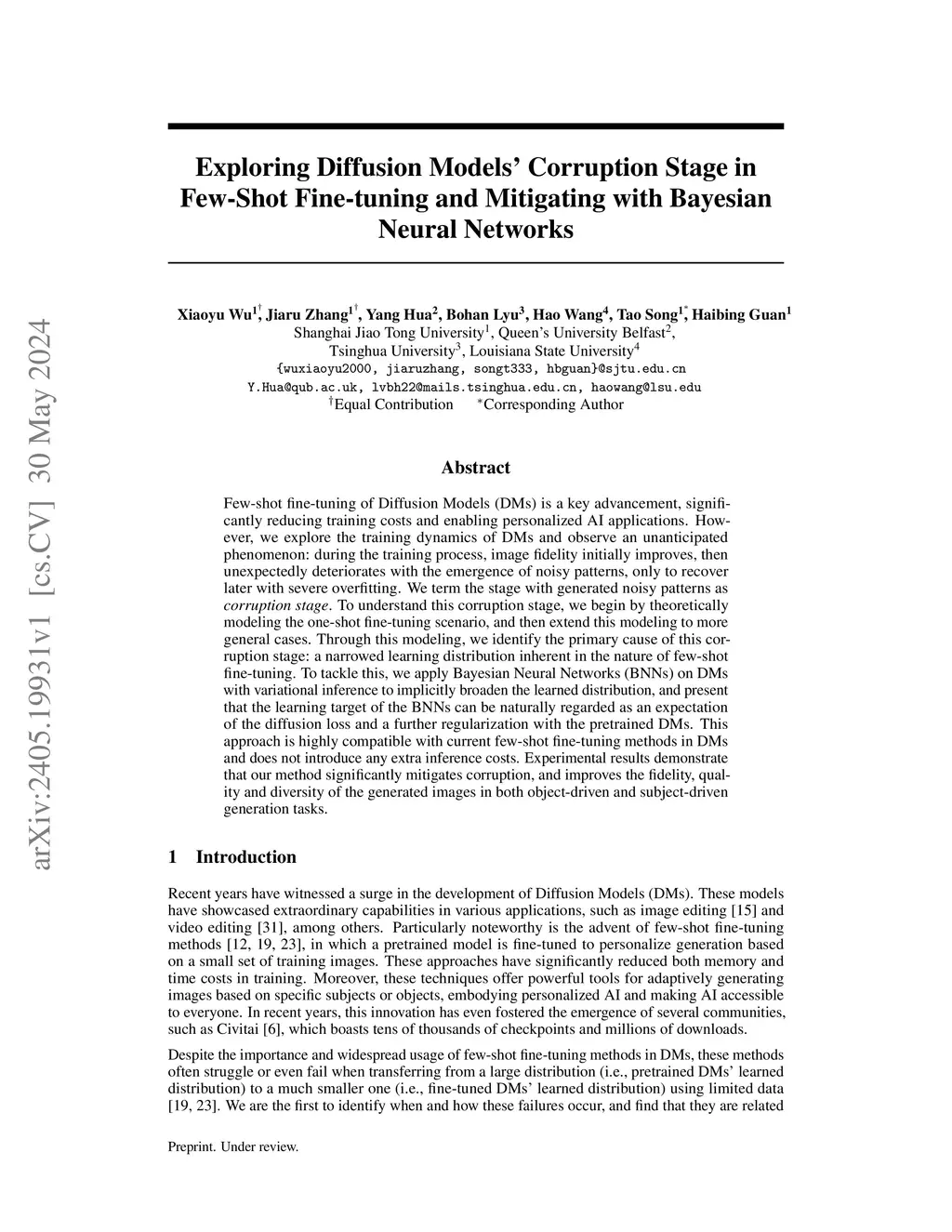 Few-shot fine-tuning of Diffusion Models (DMs) is a key advancement, significantly reducing training costs and enabling personalized AI applications. However, we explore the training dynamics of DMs and observe an unanticipated phenomenon: during the training process, image fidelity initially improves, then unexpectedly deteriorates with the emergence of noisy patterns, only to recover later with severe overfitting. We term the stage with generated noisy patterns as corruption stage. To understand this corruption stage, we begin by theoretically modeling the one-shot fine-tuning scenario, and then extend this modeling to more general cases. Through this modeling, we identify the primary cause of this corruption stage: a narrowed learning distribution inherent in the nature of few-shot fine-tuning. To tackle this, we apply Bayesian Neural Networks (BNNs) on DMs with variational inference to implicitly broaden the learned distribution, and present that the learning target of the BNNs can be naturally regarded as an expectation of the diffusion loss and a further regularization with the pretrained DMs. This approach is highly compatible with current few-shot fine-tuning methods in DMs and does not introduce any extra inference costs. Experimental results demonstrate that our method significantly mitigates corruption, and improves the fidelity, quality and diversity of the generated images in both object-driven and subject-driven generation tasks.