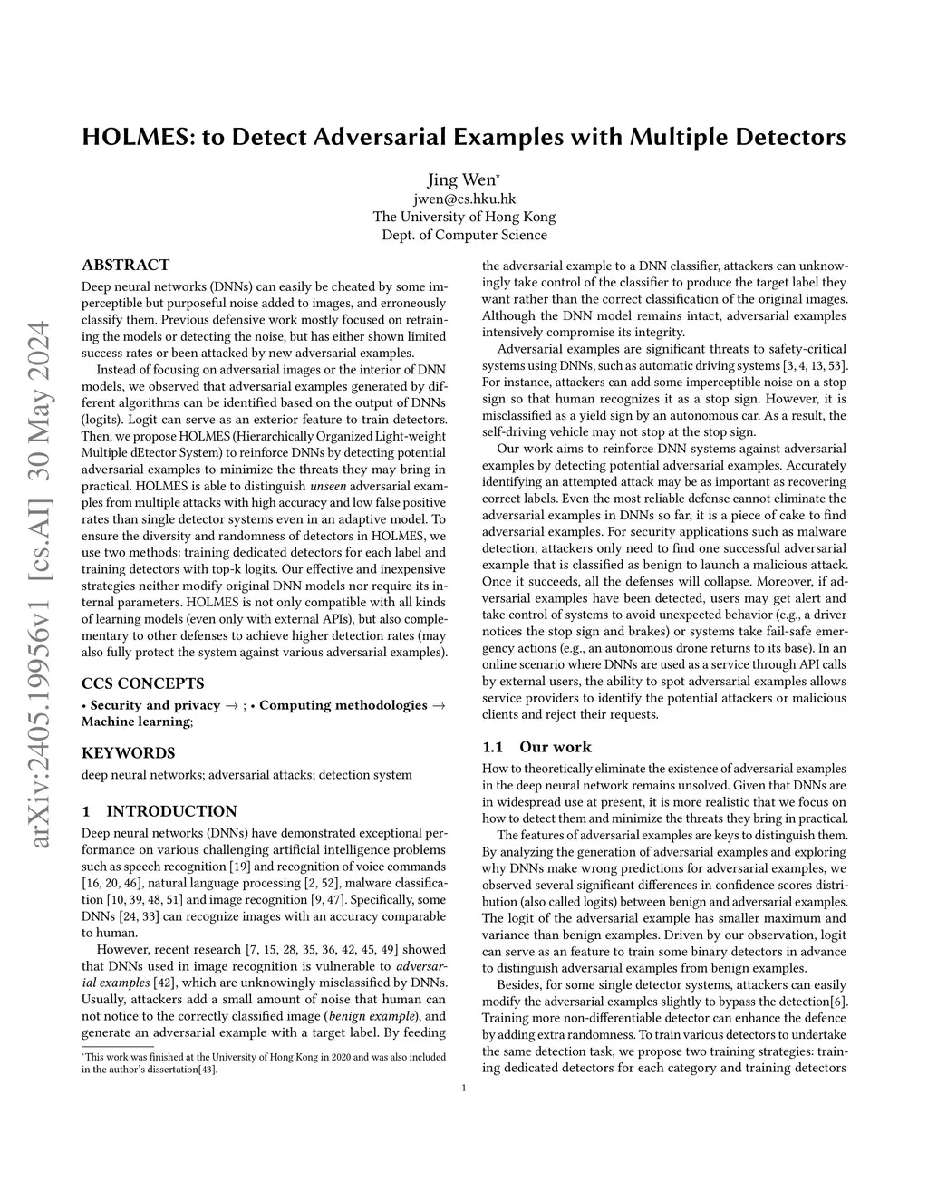Deep neural networks (DNNs) can easily be cheated by some imperceptible but purposeful noise added to images, and erroneously classify them. Previous defensive work mostly focused on retraining the models or detecting the noise, but has either shown limited success rates or been attacked by new adversarial examples. Instead of focusing on adversarial images or the interior of DNN models, we observed that adversarial examples generated by different algorithms can be identified based on the output of DNNs (logits). Logit can serve as an exterior feature to train detectors. Then, we propose HOLMES (Hierarchically Organized Light-weight Multiple dEtector System) to reinforce DNNs by detecting potential adversarial examples to minimize the threats they may bring in practical. HOLMES is able to distinguish \textit{unseen} adversarial examples from multiple attacks with high accuracy and low false positive rates than single detector systems even in an adaptive model. To ensure the diversity and randomness of detectors in HOLMES, we use two methods: training dedicated detectors for each label and training detectors with top-k logits. Our effective and inexpensive strategies neither modify original DNN models nor require its internal parameters. HOLMES is not only compatible with all kinds of learning models (even only with external APIs), but also complementary to other defenses to achieve higher detection rates (may also fully protect the system against various adversarial examples).
