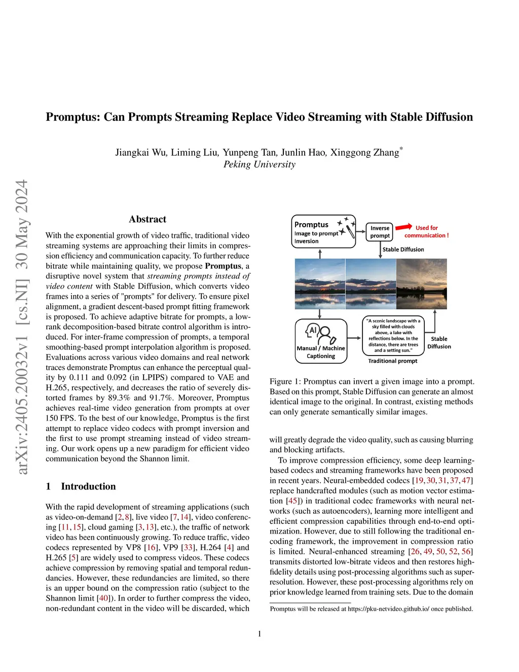 With the exponential growth of video traffic, traditional video streaming systems are approaching their limits in compression efficiency and communication capacity. To further reduce bitrate while maintaining quality, we propose Promptus, a disruptive semantic communication system that streaming prompts instead of video content, which represents real-world video frames with a series of "prompts" for delivery and employs Stable Diffusion to generate videos at the receiver. To ensure that the generated video is pixel-aligned with the original video, a gradient descent-based prompt fitting framework is proposed. Further, a low-rank decomposition-based bitrate control algorithm is introduced to achieve adaptive bitrate. For inter-frame compression, an interpolation-aware fitting algorithm is proposed. Evaluations across various video genres demonstrate that, compared to H.265, Promptus can achieve more than a 4x bandwidth reduction while preserving the same perceptual quality. On the other hand, at extremely low bitrates, Promptus can enhance the perceptual quality by 0.139 and 0.118 (in LPIPS) compared to VAE and H.265, respectively, and decreases the ratio of severely distorted frames by 89.3% and 91.7%. Our work opens up a new paradigm for efficient video communication. Promptus is open-sourced at:this https URL.