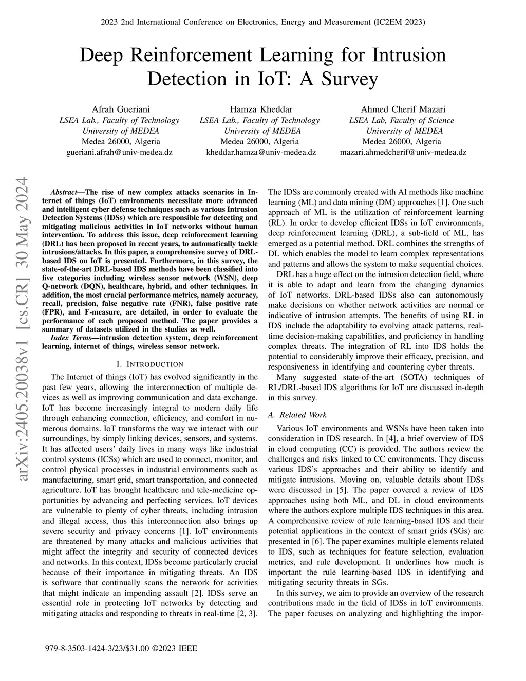 Deep Reinforcement Learning for Intrusion Detection in IoT: A Survey