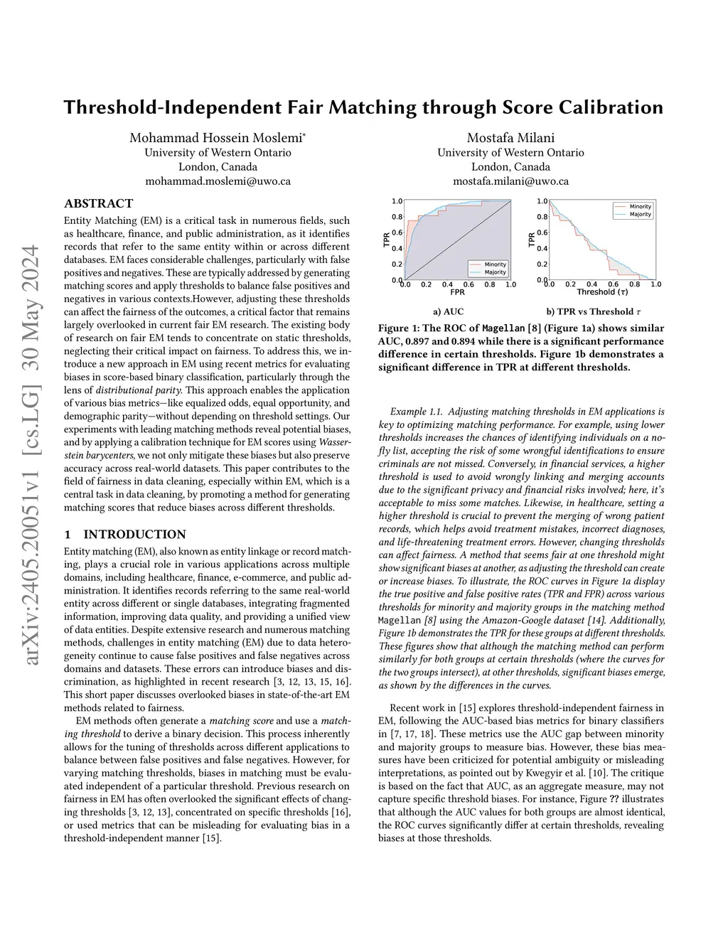 Entity Matching (EM) is a critical task in numerous fields, such as healthcare, finance, and public administration, as it identifies records that refer to the same entity within or across different databases. EM faces considerable challenges, particularly with false positives and negatives. These are typically addressed by generating matching scores and apply thresholds to balance false positives and negatives in various contexts. However, adjusting these thresholds can affect the fairness of the outcomes, a critical factor that remains largely overlooked in current fair EM research. The existing body of research on fair EM tends to concentrate on static thresholds, neglecting their critical impact on fairness. To address this, we introduce a new approach in EM using recent metrics for evaluating biases in score based binary classification, particularly through the lens of distributional parity. This approach enables the application of various bias metrics like equalized odds, equal opportunity, and demographic parity without depending on threshold settings. Our experiments with leading matching methods reveal potential biases, and by applying a calibration technique for EM scores using Wasserstein barycenters, we not only mitigate these biases but also preserve accuracy across real world datasets. This paper contributes to the field of fairness in data cleaning, especially within EM, which is a central task in data cleaning, by promoting a method for generating matching scores that reduce biases across different thresholds.