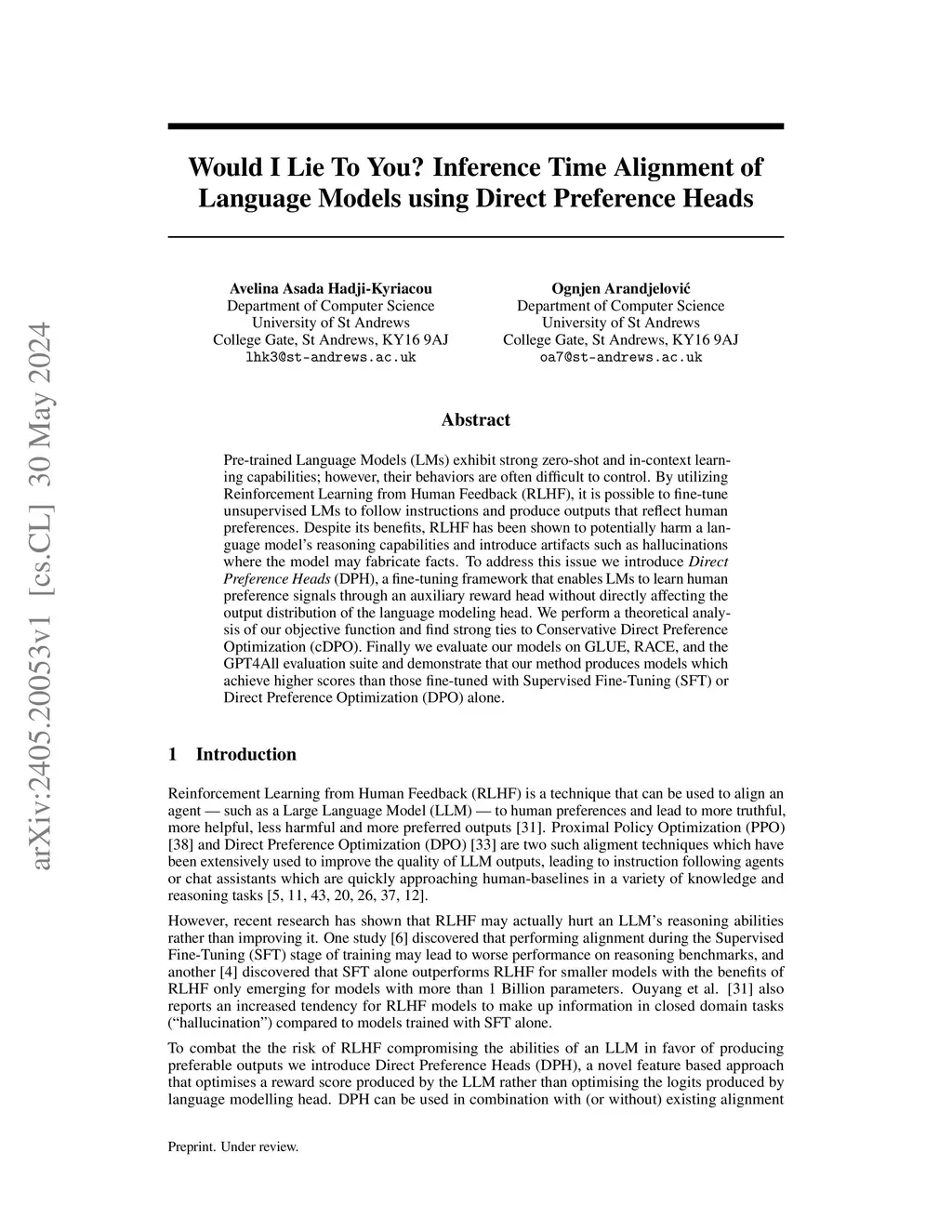 Pre-trained Language Models (LMs) exhibit strong zero-shot and in-context learning capabilities; however, their behaviors are often difficult to control. By utilizing Reinforcement Learning from Human Feedback (RLHF), it is possible to fine-tune unsupervised LMs to follow instructions and produce outputs that reflect human preferences. Despite its benefits, RLHF has been shown to potentially harm a language model's reasoning capabilities and introduce artifacts such as hallucinations where the model may fabricate facts. To address this issue we introduce Direct Preference Heads (DPH), a fine-tuning framework that enables LMs to learn human preference signals through an auxiliary reward head without directly affecting the output distribution of the language modeling head. We perform a theoretical analysis of our objective function and find strong ties to Conservative Direct Preference Optimization (cDPO). Finally we evaluate our models on GLUE, RACE, and the GPT4All evaluation suite and demonstrate that our method produces models which achieve higher scores than those fine-tuned with Supervised Fine-Tuning (SFT) or Direct Preference Optimization (DPO) alone.
