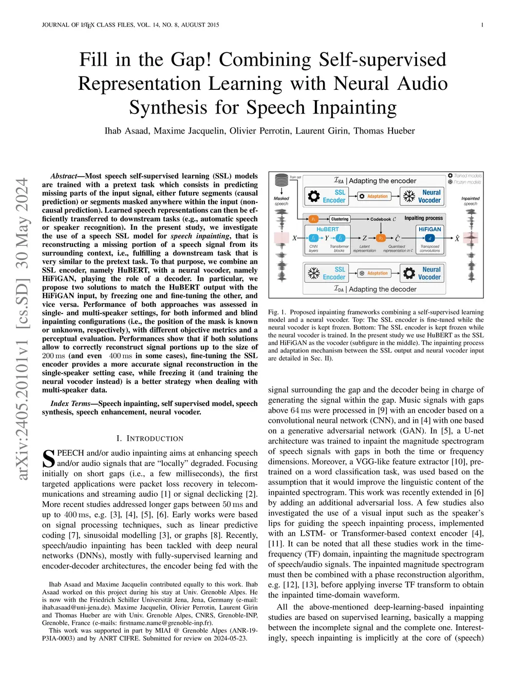 Speech inpainting consists in reconstructing corrupted or missing speech segments using surrounding context, a process that closely resembles the pretext tasks in Self-Supervised Learning (SSL) for speech encoders. This study investigates using SSL-trained speech encoders for inpainting without any additional training beyond the initial pretext task, and simply adding a decoder to generate a waveform. We compare this approach to supervised fine-tuning of speech encoders for a downstream task -- here, inpainting. Practically, we integrate HuBERT as the SSL encoder and HiFi-GAN as the decoder in two configurations: (1) fine-tuning the decoder to align with the frozen pre-trained encoder's output and (2) fine-tuning the encoder for an inpainting task based on a frozen decoder's input. Evaluations are conducted under single- and multi-speaker conditions using in-domain datasets and out-of-domain datasets (including unseen speakers, diverse speaking styles, and noise). Both informed and blind inpainting scenarios are considered, where the position of the corrupted segment is either known or unknown. The proposed SSL-based methods are benchmarked against several baselines, including a text-informed method combining automatic speech recognition with zero-shot text-to-speech synthesis. Performance is assessed using objective metrics and perceptual evaluations. The results demonstrate that both approaches outperform baselines, successfully reconstructing speech segments up to 200 ms, and sometimes up to 400 ms. Notably, fine-tuning the SSL encoder achieves more accurate speech reconstruction in single-speaker settings, while a pre-trained encoder proves more effective for multi-speaker scenarios. This demonstrates that an SSL pretext task can transfer to speech inpainting, enabling successful speech reconstruction with a pre-trained encoder.