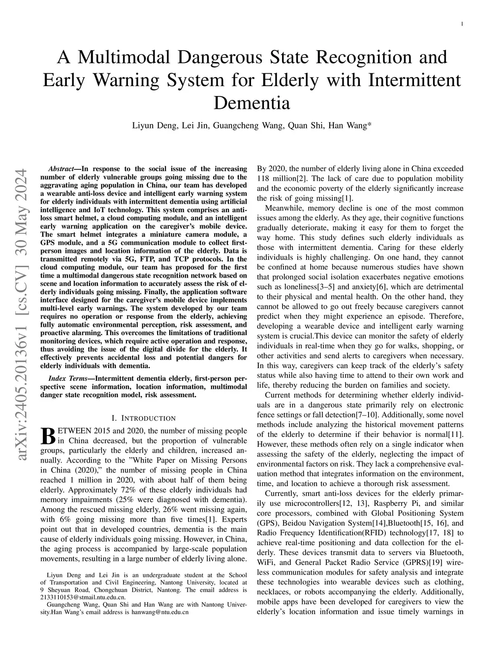 In response to the social issue of the increasing number of elderly vulnerable groups going missing due to the aggravating aging population in China, our team has developed a wearable anti-loss device and intelligent early warning system for elderly individuals with intermittent dementia using artificial intelligence and IoT technology. This system comprises an anti-loss smart helmet, a cloud computing module, and an intelligent early warning application on the caregiver's mobile device. The smart helmet integrates a miniature camera module, a GPS module, and a 5G communication module to collect first-person images and location information of the elderly. Data is transmitted remotely via 5G, FTP, and TCP protocols. In the cloud computing module, our team has proposed for the first time a multimodal dangerous state recognition network based on scene and location information to accurately assess the risk of elderly individuals going missing. Finally, the application software interface designed for the caregiver's mobile device implements multi-level early warnings. The system developed by our team requires no operation or response from the elderly, achieving fully automatic environmental perception, risk assessment, and proactive alarming. This overcomes the limitations of traditional monitoring devices, which require active operation and response, thus avoiding the issue of the digital divide for the elderly. It effectively prevents accidental loss and potential dangers for elderly individuals with dementia.