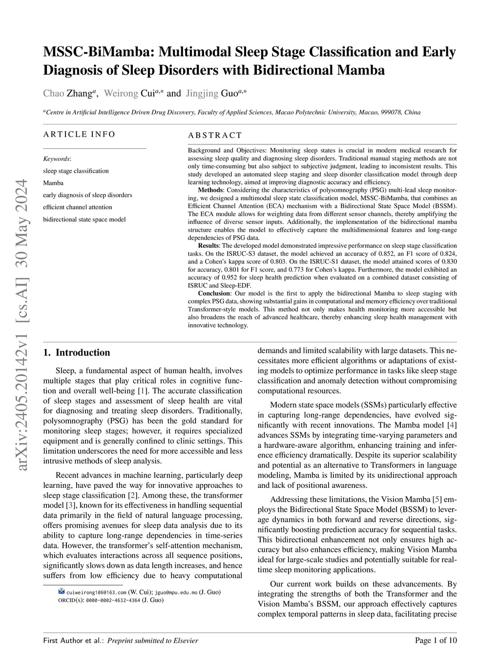 MSSC-BiMamba: Multimodal Sleep Stage Classification and Early Diagnosis