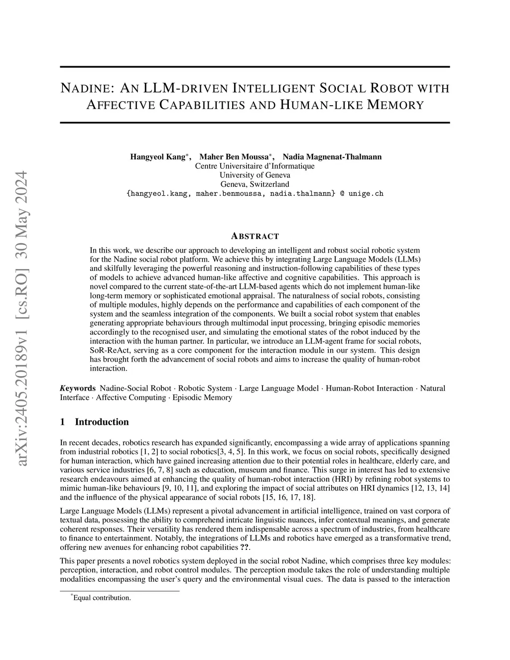 In this work, we describe our approach to developing an intelligent and robust social robotic system for the Nadine social robot platform. We achieve this by integrating Large Language Models (LLMs) and skilfully leveraging the powerful reasoning and instruction-following capabilities of these types of models to achieve advanced human-like affective and cognitive capabilities. This approach is novel compared to the current state-of-the-art LLM-based agents which do not implement human-like long-term memory or sophisticated emotional appraisal. The naturalness of social robots, consisting of multiple modules, highly depends on the performance and capabilities of each component of the system and the seamless integration of the components. We built a social robot system that enables generating appropriate behaviours through multimodal input processing, bringing episodic memories accordingly to the recognised user, and simulating the emotional states of the robot induced by the interaction with the human partner. In particular, we introduce an LLM-agent frame for social robots, SoR-ReAct, serving as a core component for the interaction module in our system. This design has brought forth the advancement of social robots and aims to increase the quality of human-robot interaction.