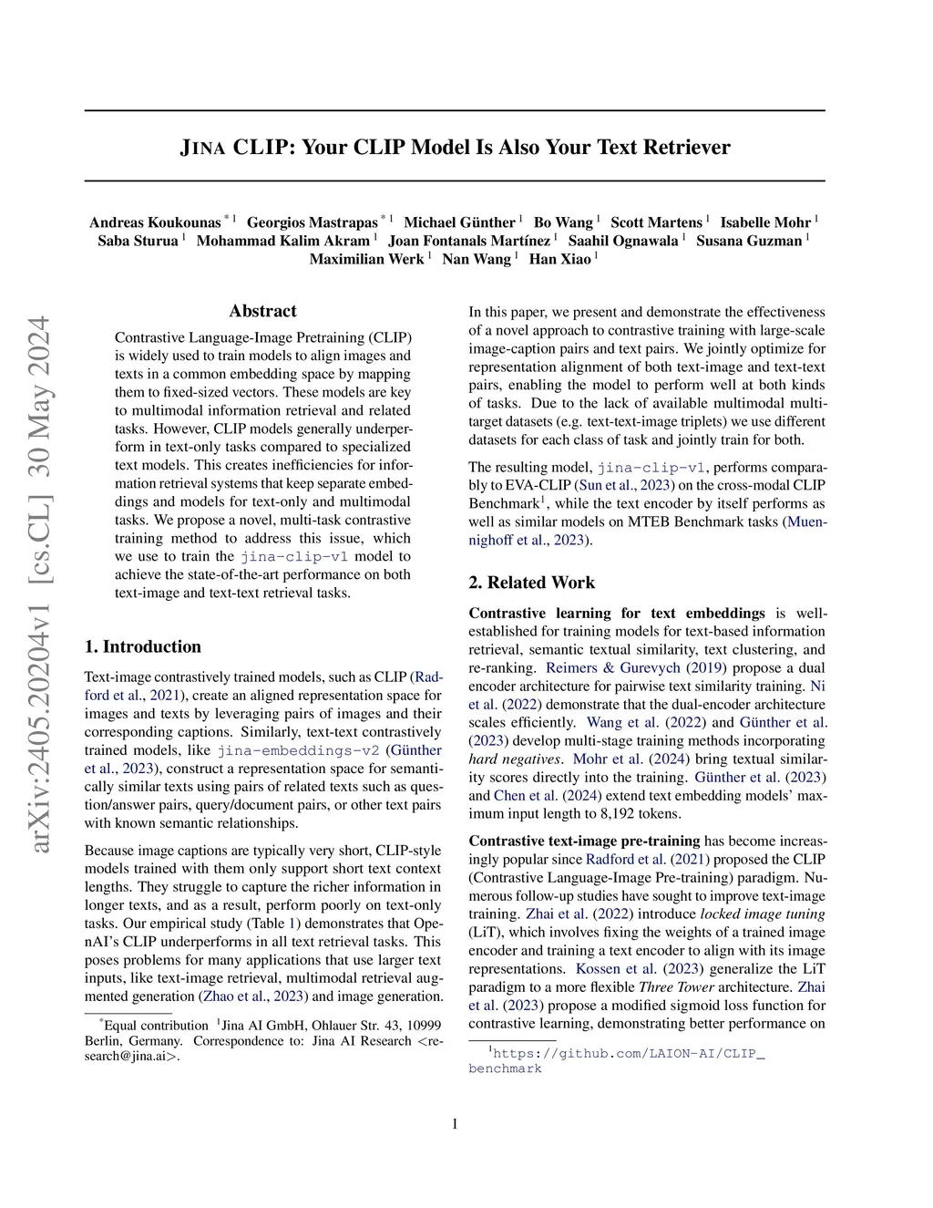 Contrastive Language-Image Pretraining (CLIP) is widely used to train models to align images and texts in a common embedding space by mapping them to fixed-sized vectors. These models are key to multimodal information retrieval and related tasks. However, CLIP models generally underperform in text-only tasks compared to specialized text models. This creates inefficiencies for information retrieval systems that keep separate embeddings and models for text-only and multimodal tasks. We propose a novel, multi-task contrastive training method to address this issue, which we use to train the jina-clip-v1 model to achieve the state-of-the-art performance on both text-image and text-text retrieval tasks.