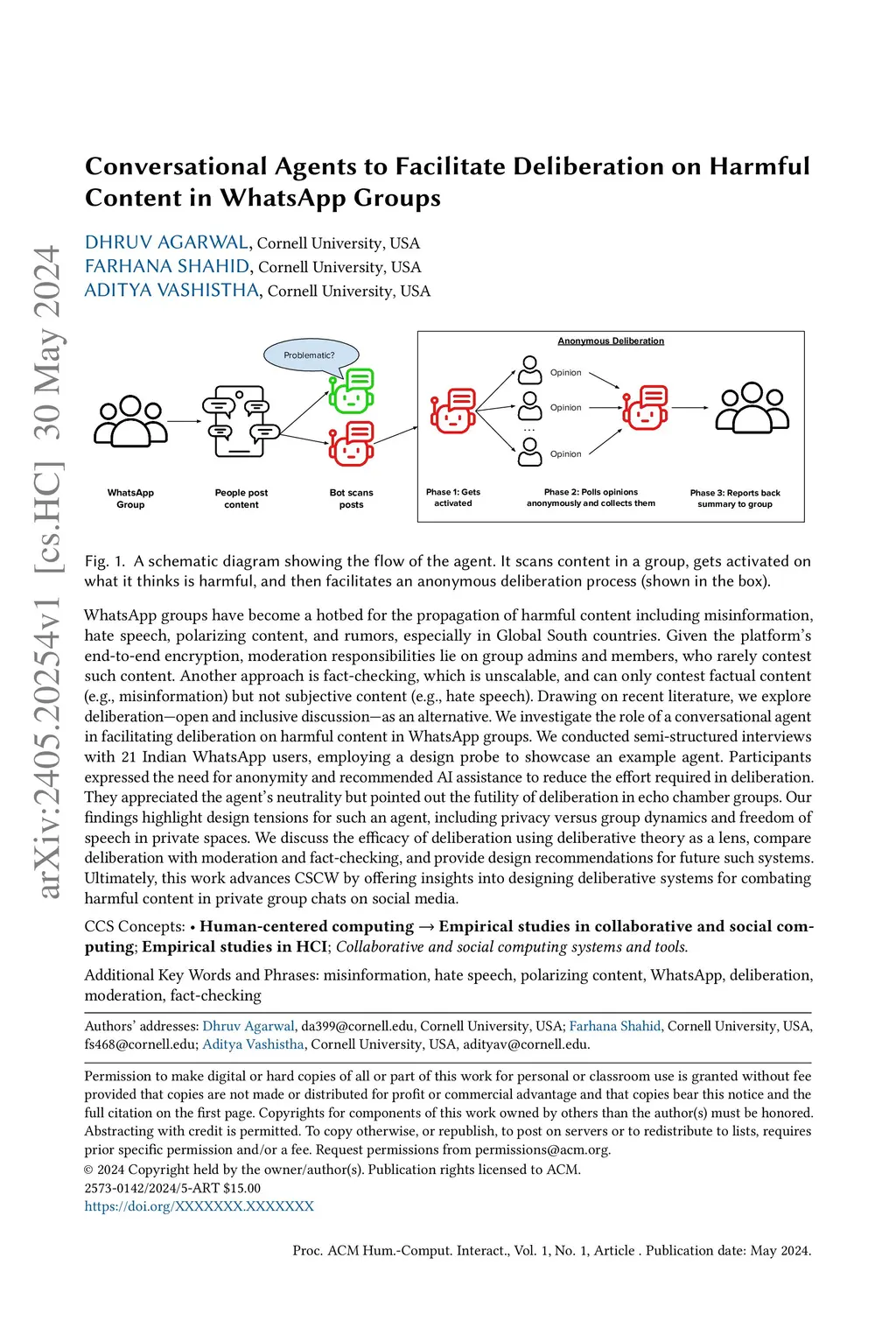WhatsApp groups have become a hotbed for the propagation of harmful content including misinformation, hate speech, polarizing content, and rumors, especially in Global South countries. Given the platform's end-to-end encryption, moderation responsibilities lie on group admins and members, who rarely contest such content. Another approach is fact-checking, which is unscalable, and can only contest factual content (e.g., misinformation) but not subjective content (e.g., hate speech). Drawing on recent literature, we explore deliberation -- open and inclusive discussion -- as an alternative. We investigate the role of a conversational agent in facilitating deliberation on harmful content in WhatsApp groups. We conducted semi-structured interviews with 21 Indian WhatsApp users, employing a design probe to showcase an example agent. Participants expressed the need for anonymity and recommended AI assistance to reduce the effort required in deliberation. They appreciated the agent's neutrality but pointed out the futility of deliberation in echo chamber groups. Our findings highlight design tensions for such an agent, including privacy versus group dynamics and freedom of speech in private spaces. We discuss the efficacy of deliberation using deliberative theory as a lens, compare deliberation with moderation and fact-checking, and provide design recommendations for future such systems. Ultimately, this work advances CSCW by offering insights into designing deliberative systems for combating harmful content in private group chats on social media.
