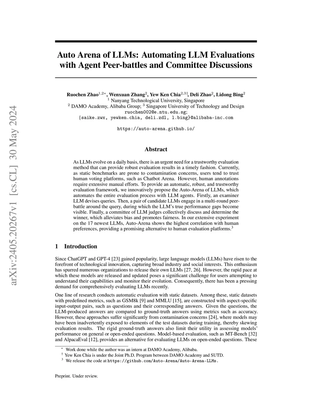 As LLMs evolve on a daily basis, there is an urgent need for a trustworthy evaluation method that can provide robust evaluation results in a timely fashion. Currently, as static benchmarks are prone to contamination concerns, users tend to trust human voting platforms, such as Chatbot Arena. However, human annotations require extensive manual efforts. To provide an automatic, robust, and trustworthy evaluation framework, we innovatively propose the Auto-Arena of LLMs, which automates the entire evaluation process with LLM agents. Firstly, an examiner LLM devises queries. Then, a pair of candidate LLMs engage in a multi-round peer-battle around the query, during which the LLM's true performance gaps become visible. Finally, a committee of LLM judges collectively discuss and determine the winner, which alleviates bias and promotes fairness. In our extensive experiment on the 17 newest LLMs, Auto-Arena shows the highest correlation with human preferences, providing a promising alternative to human evaluation platforms.