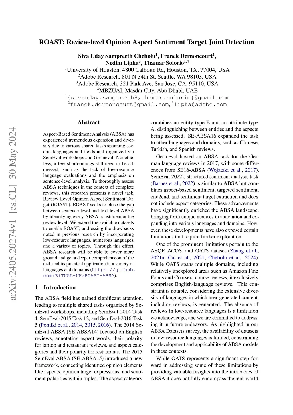 Aspect-Based Sentiment Analysis (ABSA) has experienced tremendous expansion and diversity due to various shared tasks spanning several languages and fields and organized via SemEval workshops and Germeval. Nonetheless, a few shortcomings still need to be addressed, such as the lack of low-resource language evaluations and the emphasis on sentence-level analysis. To thoroughly assess ABSA techniques in the context of complete reviews, this research presents a novel task, Review-Level Opinion Aspect Sentiment Target (ROAST). ROAST seeks to close the gap between sentence-level and text-level ABSA by identifying every ABSA constituent at the review level. We extend the available datasets to enable ROAST, addressing the drawbacks noted in previous research by incorporating low-resource languages, numerous languages, and a variety of topics. Through this effort, ABSA research will be able to cover more ground and get a deeper comprehension of the task and its practical application in a variety of languages and domains (https://github.com/RiTUAL-UH/ROAST-ABSA).