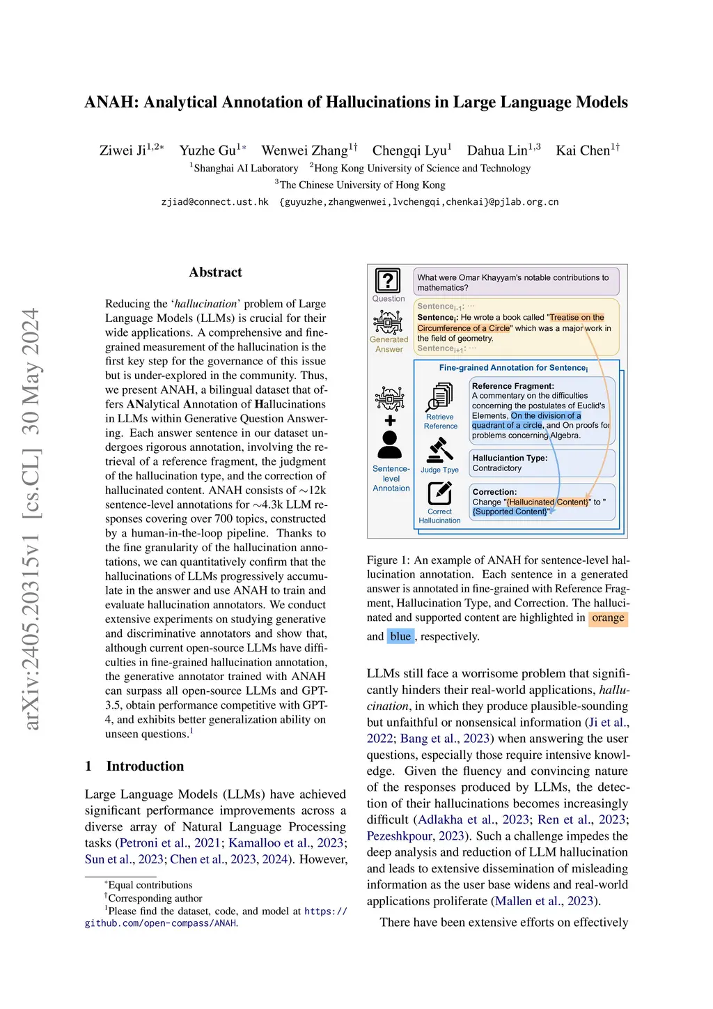 Reducing the `' problem of Large Language Models (LLMs) is crucial for their wide applications. A comprehensive and fine-grained measurement of the hallucination is the first key step for the governance of this issue but is under-explored in the community. Thus, we present , a bilingual dataset that offers alytical nnotation of allucinations in LLMs within Generative Question Answering. Each answer sentence in our dataset undergoes rigorous annotation, involving the retrieval of a reference fragment, the judgment of the hallucination type, and the correction of hallucinated content. ANAH consists of ~12k sentence-level annotations for ~4.3k LLM responses covering over 700 topics, constructed by a human-in-the-loop pipeline. Thanks to the fine granularity of the hallucination annotations, we can quantitatively confirm that the hallucinations of LLMs progressively accumulate in the answer and use ANAH to train and evaluate hallucination annotators. We conduct extensive experiments on studying generative and discriminative annotators and show that, although current open-source LLMs have difficulties in fine-grained hallucination annotation, the generative annotator trained with ANAH can surpass all open-source LLMs and GPT-3.5, obtain performance competitive with GPT-4, and exhibits better generalization ability on unseen questions.