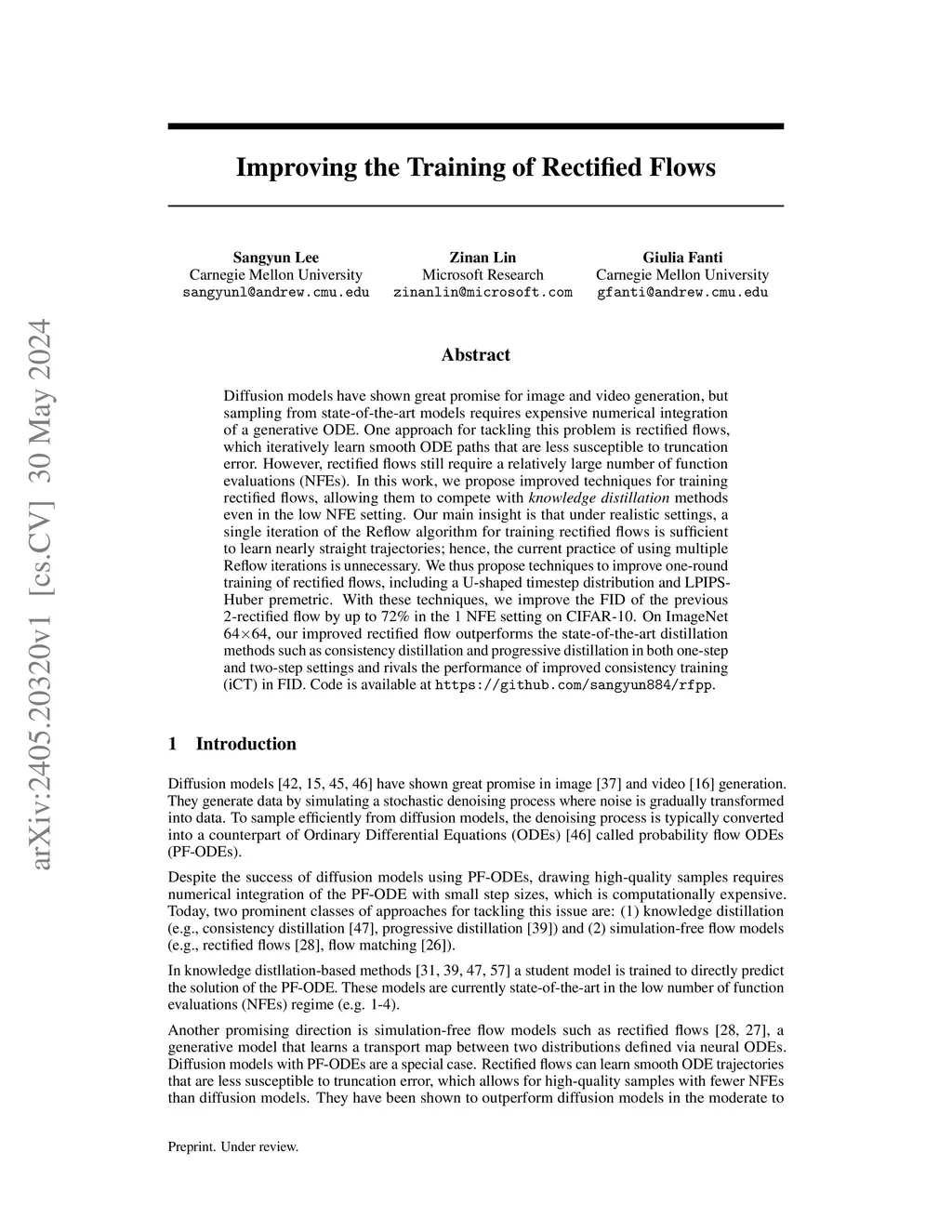 Diffusion models have shown great promise for image and video generation, but sampling from state-of-the-art models requires expensive numerical integration of a generative ODE. One approach for tackling this problem is rectified flows, which iteratively learn smooth ODE paths that are less susceptible to truncation error. However, rectified flows still require a relatively large number of function evaluations (NFEs). In this work, we propose improved techniques for training rectified flows, allowing them to compete with knowledge distillation methods even in the low NFE setting. Our main insight is that under realistic settings, a single iteration of the Reflow algorithm for training rectified flows is sufficient to learn nearly straight trajectories; hence, the current practice of using multiple Reflow iterations is unnecessary. We thus propose techniques to improve one-round training of rectified flows, including a U-shaped timestep distribution and LPIPS-Huber premetric. With these techniques, we improve the FID of the previous 2-rectified flow by up to 72% in the 1 NFE setting on CIFAR-10. On ImageNet 6464, our improved rectified flow outperforms the state-of-the-art distillation methods such as consistency distillation and progressive distillation in both one-step and two-step settings and rivals the performance of improved consistency training (iCT) in FID. Code is available at https://github.com/sangyun884/rfpp.