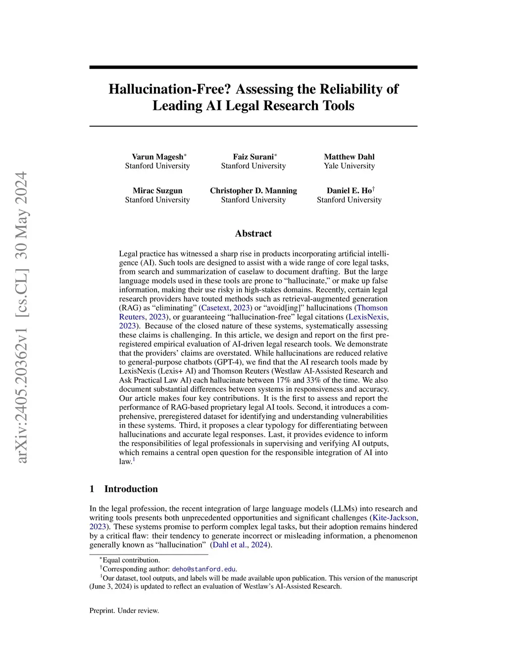 Hallucination-Free? Assessing the Reliability of Leading AI Legal