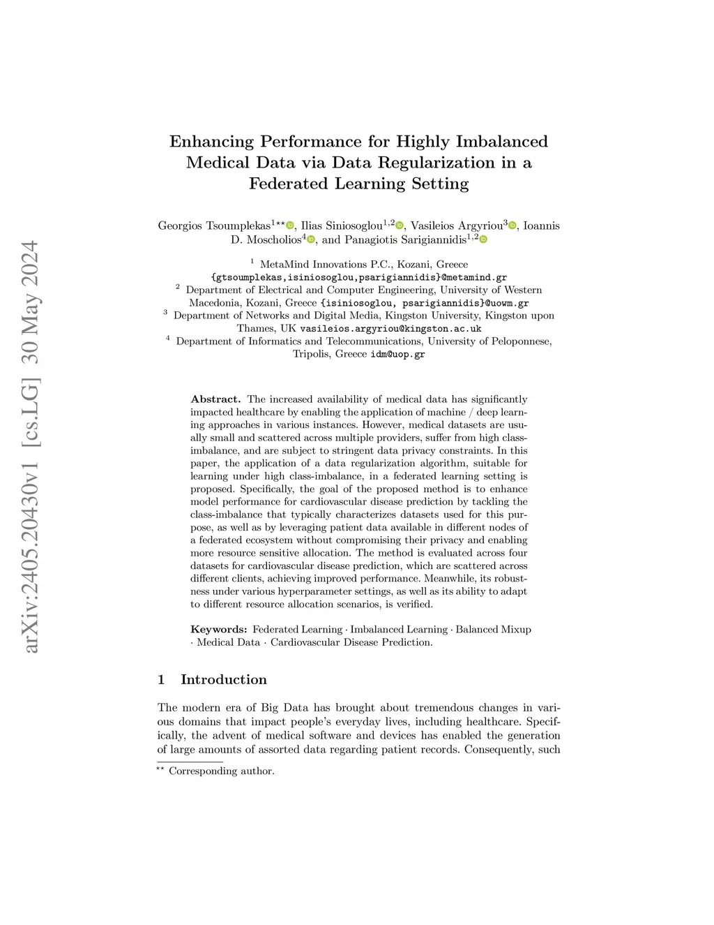 The increased availability of medical data has significantly impacted healthcare by enabling the application of machine / deep learning approaches in various instances. However, medical datasets are usually small and scattered across multiple providers, suffer from high class-imbalance, and are subject to stringent data privacy constraints. In this paper, the application of a data regularization algorithm, suitable for learning under high class-imbalance, in a federated learning setting is proposed. Specifically, the goal of the proposed method is to enhance model performance for cardiovascular disease prediction by tackling the class-imbalance that typically characterizes datasets used for this purpose, as well as by leveraging patient data available in different nodes of a federated ecosystem without compromising their privacy and enabling more resource sensitive allocation. The method is evaluated across four datasets for cardiovascular disease prediction, which are scattered across different clients, achieving improved performance. Meanwhile, its robustness under various hyperparameter settings, as well as its ability to adapt to different resource allocation scenarios, is verified.
