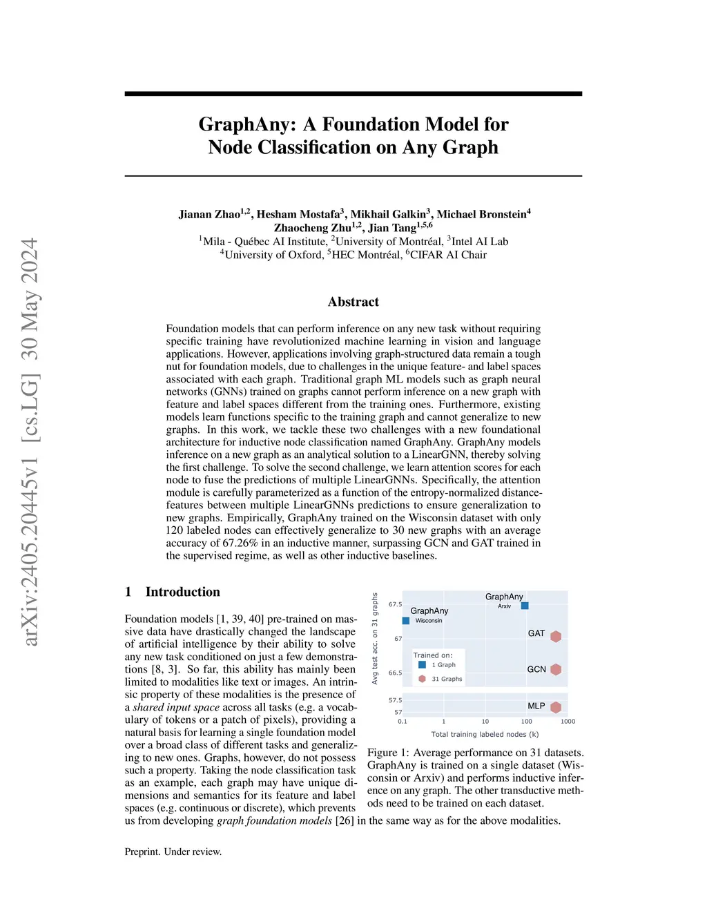 One fundamental challenge in graph machine learning is generalizing to new graphs. Many existing methods following the inductive setup can generalize to test graphs with new structures, but assuming the feature and label spaces remain the same as the training ones. This paper introduces a fully-inductive setup, where models should perform inference on arbitrary test graphs with new structures, feature and label spaces. We propose GraphAny as the first attempt at this challenging setup. GraphAny models inference on a new graph as an analytical solution to a LinearGNN, which can be naturally applied to graphs with any feature and label spaces. To further build a stronger model with learning capacity, we fuse multiple LinearGNN predictions with learned inductive attention scores. Specifically, the attention module is carefully parameterized as a function of the entropy-normalized distance features between pairs of LinearGNN predictions to ensure generalization to new graphs. Empirically, GraphAny trained on a single Wisconsin dataset with only 120 labeled nodes can generalize to 30 new graphs with an average accuracy of 67.26%, surpassing not only all inductive baselines, but also strong transductive methods trained separately on each of the 30 test graphs.