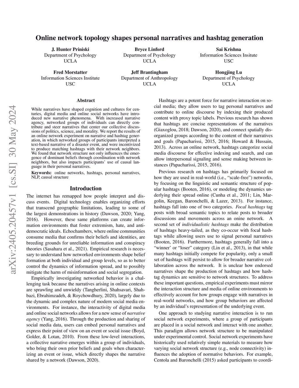 While narratives have shaped cognition and cultures for centuries, digital media and online social networks have introduced new narrative phenomena. With increased narrative agency, networked groups of individuals can directly contribute and steer narratives that center our collective discussions of politics, science, and morality. We report the results of an online network experiment on narrative and hashtag generation, in which networked groups of participants interpreted a text-based narrative of a disaster event, and were incentivized to produce matching hashtags with their network neighbors. We found that network structure not only influences the emergence of dominant beliefs through coordination with network neighbors, but also impacts participants' use of causal language in their personal narratives.