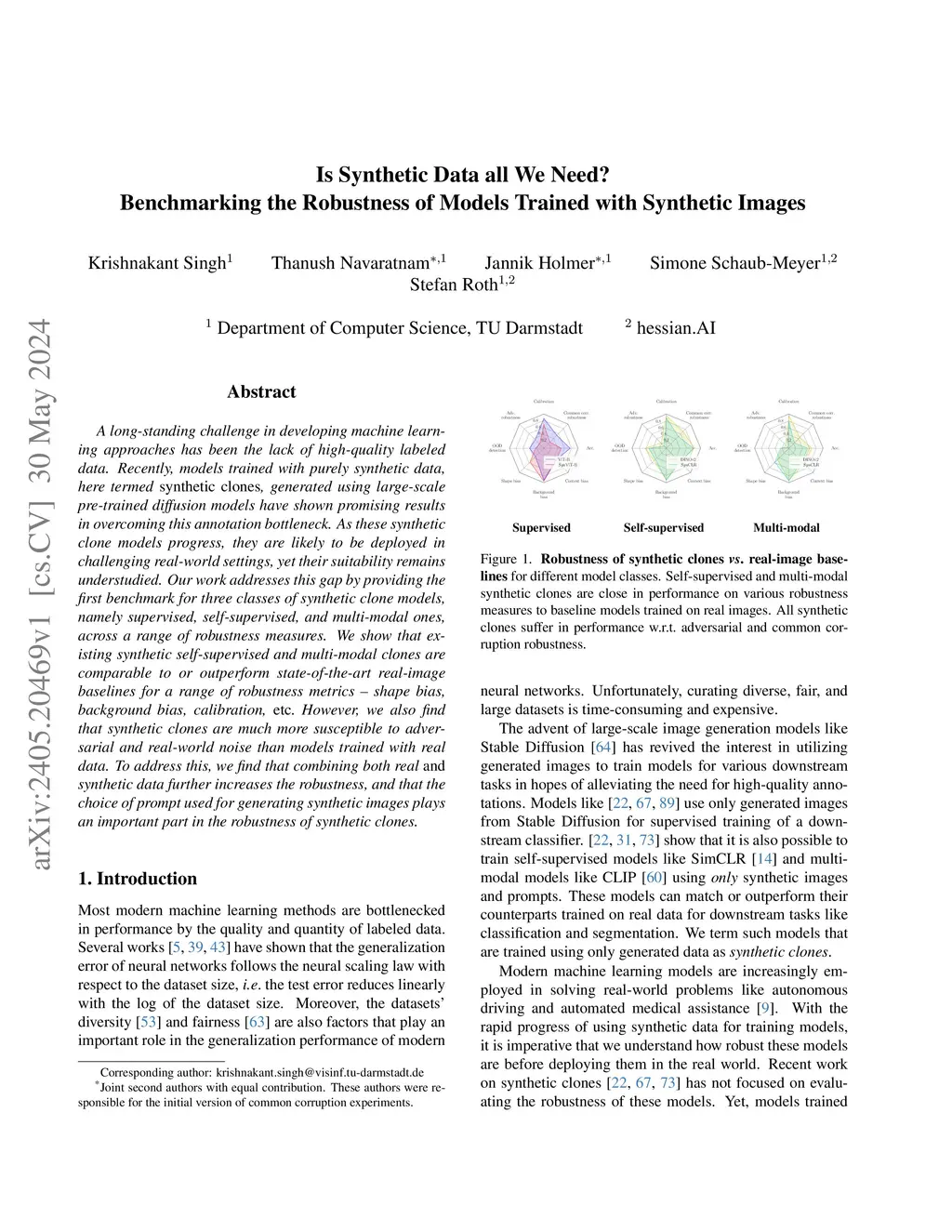 A long-standing challenge in developing machine learning approaches has been the lack of high-quality labeled data. Recently, models trained with purely synthetic data, here termed synthetic clones, generated using large-scale pre-trained diffusion models have shown promising results in overcoming this annotation bottleneck. As these synthetic clone models progress, they are likely to be deployed in challenging real-world settings, yet their suitability remains understudied. Our work addresses this gap by providing the first benchmark for three classes of synthetic clone models, namely supervised, self-supervised, and multi-modal ones, across a range of robustness measures. We show that existing synthetic self-supervised and multi-modal clones are comparable to or outperform state-of-the-art real-image baselines for a range of robustness metrics - shape bias, background bias, calibration, etc. However, we also find that synthetic clones are much more susceptible to adversarial and real-world noise than models trained with real data. To address this, we find that combining both real and synthetic data further increases the robustness, and that the choice of prompt used for generating synthetic images plays an important part in the robustness of synthetic clones.