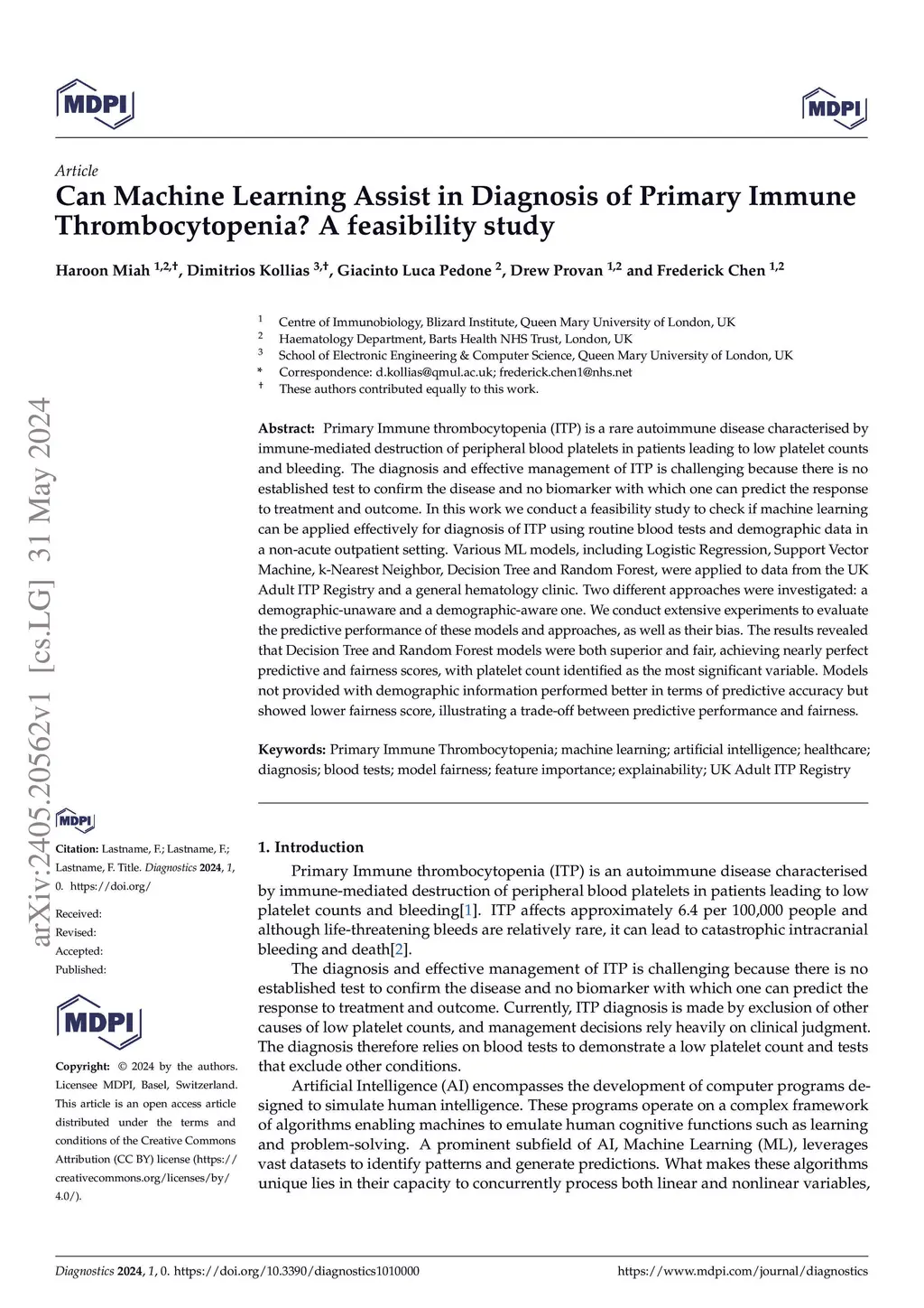 Primary Immune thrombocytopenia (ITP) is a rare autoimmune disease characterised by immune-mediated destruction of peripheral blood platelets in patients leading to low platelet counts and bleeding. The diagnosis and effective management of ITP is challenging because there is no established test to confirm the disease and no biomarker with which one can predict the response to treatment and outcome. In this work we conduct a feasibility study to check if machine learning can be applied effectively for diagnosis of ITP using routine blood tests and demographic data in a non-acute outpatient setting. Various ML models, including Logistic Regression, Support Vector Machine, k-Nearest Neighbor, Decision Tree and Random Forest, were applied to data from the UK Adult ITP Registry and a general hematology clinic. Two different approaches were investigated: a demographic-unaware and a demographic-aware one. We conduct extensive experiments to evaluate the predictive performance of these models and approaches, as well as their bias. The results revealed that Decision Tree and Random Forest models were both superior and fair, achieving nearly perfect predictive and fairness scores, with platelet count identified as the most significant variable. Models not provided with demographic information performed better in terms of predictive accuracy but showed lower fairness score, illustrating a trade-off between predictive performance and fairness.