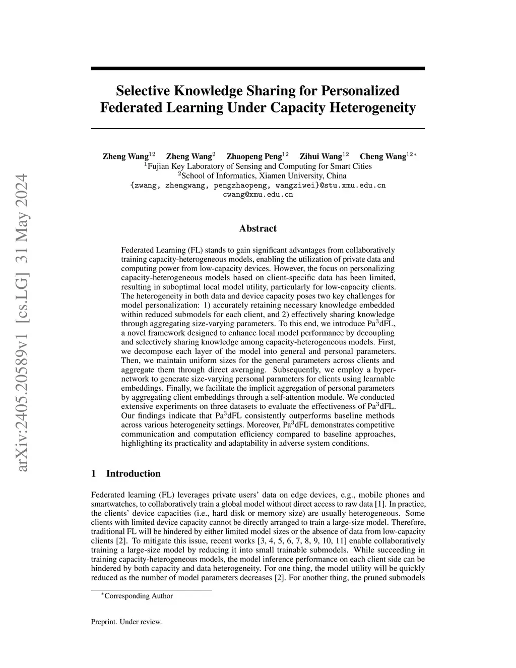 Federated Learning (FL) stands to gain significant advantages from collaboratively training capacity-heterogeneous models, enabling the utilization of private data and computing power from low-capacity devices. However, the focus on personalizing capacity-heterogeneous models based on client-specific data has been limited, resulting in suboptimal local model utility, particularly for low-capacity clients. The heterogeneity in both data and device capacity poses two key challenges for model personalization: 1) accurately retaining necessary knowledge embedded within reduced submodels for each client, and 2) effectively sharing knowledge through aggregating size-varying parameters. To this end, we introduce Pa3dFL, a novel framework designed to enhance local model performance by decoupling and selectively sharing knowledge among capacity-heterogeneous models. First, we decompose each layer of the model into general and personal parameters. Then, we maintain uniform sizes for the general parameters across clients and aggregate them through direct averaging. Subsequently, we employ a hyper-network to generate size-varying personal parameters for clients using learnable embeddings. Finally, we facilitate the implicit aggregation of personal parameters by aggregating client embeddings through a self-attention module. We conducted extensive experiments on three datasets to evaluate the effectiveness of Pa3dFL. Our findings indicate that Pa3dFL consistently outperforms baseline methods across various heterogeneity settings. Moreover, Pa3dFL demonstrates competitive communication and computation efficiency compared to baseline approaches, highlighting its practicality and adaptability in adverse system conditions.