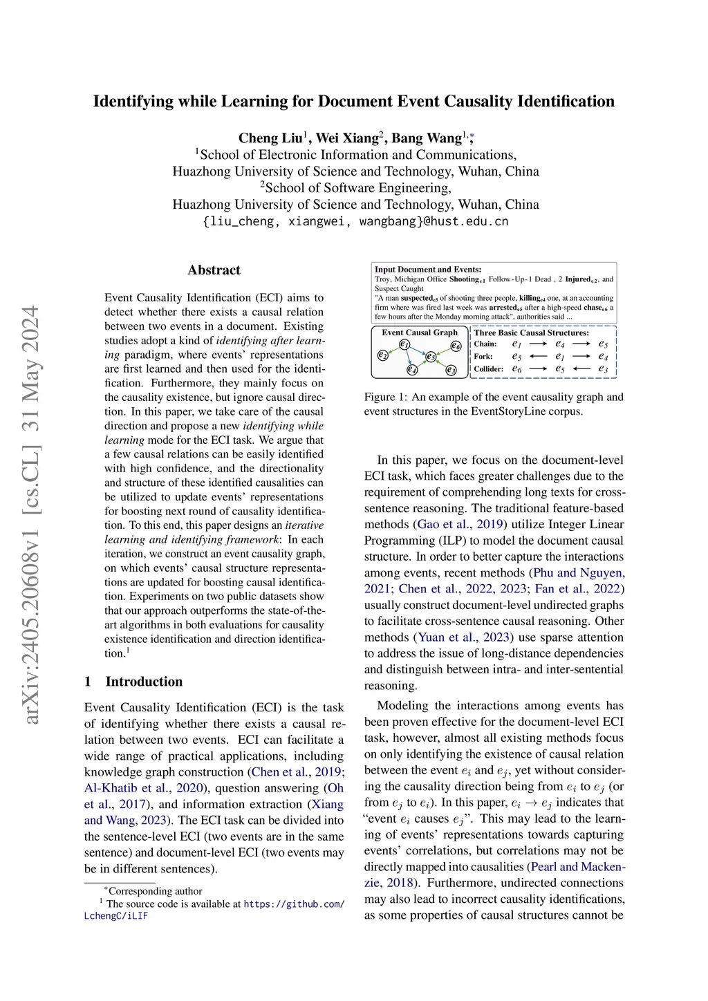 Event Causality Identification (ECI) aims to detect whether there exists a causal relation between two events in a document. Existing studies adopt a kind of identifying after learning paradigm, where events' representations are first learned and then used for the identification. Furthermore, they mainly focus on the causality existence, but ignoring causal direction. In this paper, we take care of the causal direction and propose a new identifying while learning mode for the ECI task. We argue that a few causal relations can be easily identified with high confidence, and the directionality and structure of these identified causalities can be utilized to update events' representations for boosting next round of causality identification. To this end, this paper designs an *iterative learning and identifying framework*: In each iteration, we construct an event causality graph, on which events' causal structure representations are updated for boosting causal identification. Experiments on two public datasets show that our approach outperforms the state-of-the-art algorithms in both evaluations for causality existence identification and direction identification.