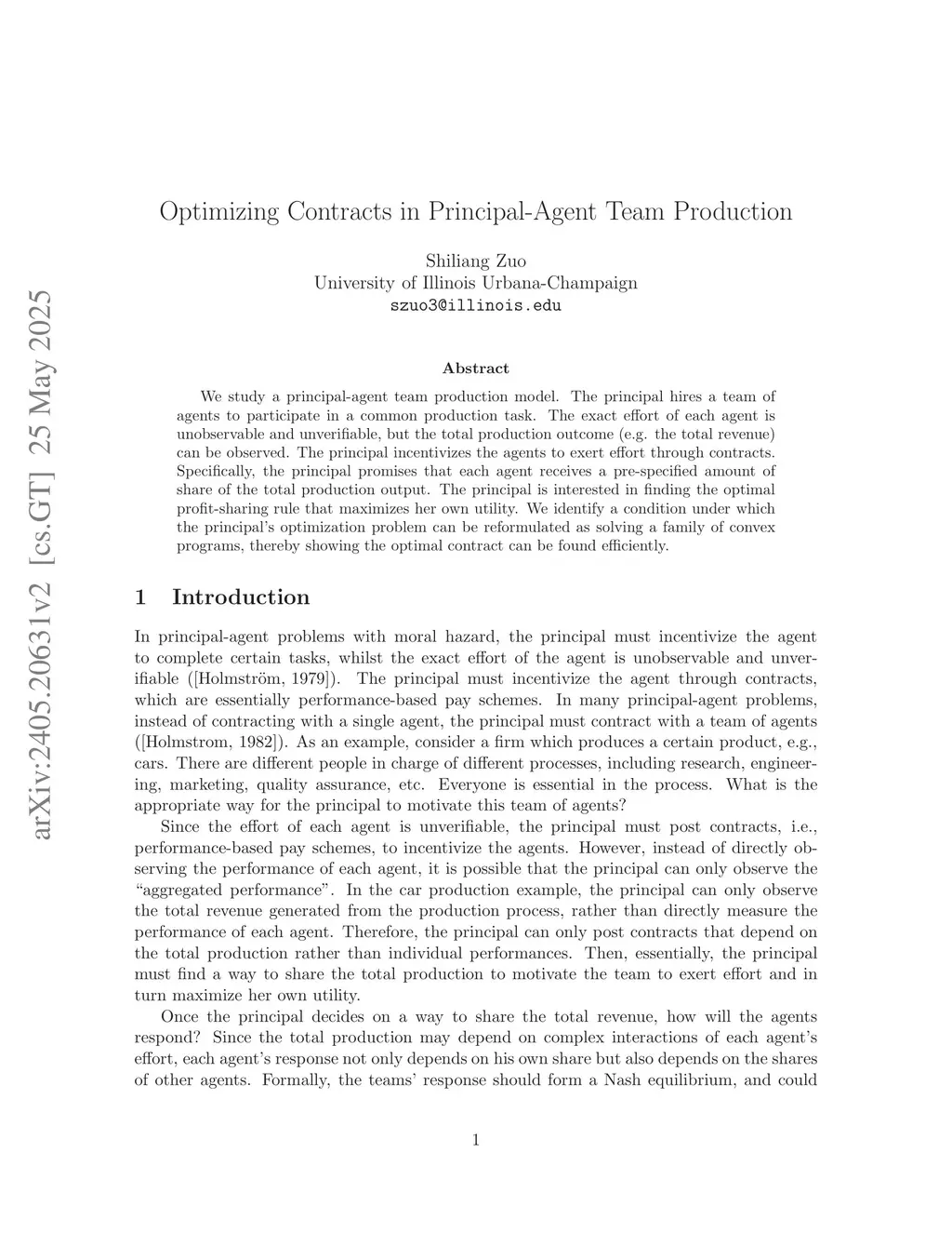We study a principal-agent team production model. The principal hires a team of agents to participate in a common production task. The exact effort of each agent is unobservable and unverifiable, but the total production outcome (e.g. the total revenue) can be observed. The principal incentivizes the agents to exert effort through contracts. Specifically, the principal promises that each agent receives a pre-specified amount of share of the total production output. The principal is interested in finding the optimal profit-sharing rule that maximizes her own utility. We identify a condition under which the principal's optimization problem can be reformulated as solving a family of convex programs, thereby showing the optimal contract can be found efficiently.