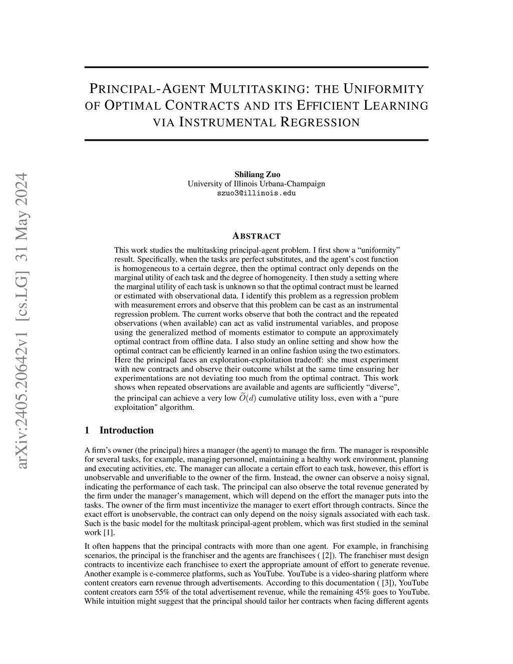 In this work, we study the multitasking principal-agent problem. The agent performs several task for the principal, and the principal posts a contract incentivizing the agent to exert effort. The principal can observe a signal for each task, and the contract is a mapping from the space of possible signals to a payment. We study the special class of linear contracts from three perspectives: robustness, uniformity, and learning. Firstly, we show a robustness result: in an ambiguous setting when only first moment information is known, there is a linear contract maximizing the principal's payoff in a worst-case scenario. Secondly, we show a uniformity result: when the agent's cost function is homogeneous to a certain degree and the the principal's utility takes a linear form across tasks, then the optimal contract depends on the agent's cost function only through its homogeneuity degree. Thirdly, we study the problem of learning an optimal linear contract through observational data. We identify this as an measurement error model, and propose instrumental regression methods to estimate the optimal contract parameters in an offline setting, or to learn the optimal contract in an online setting.