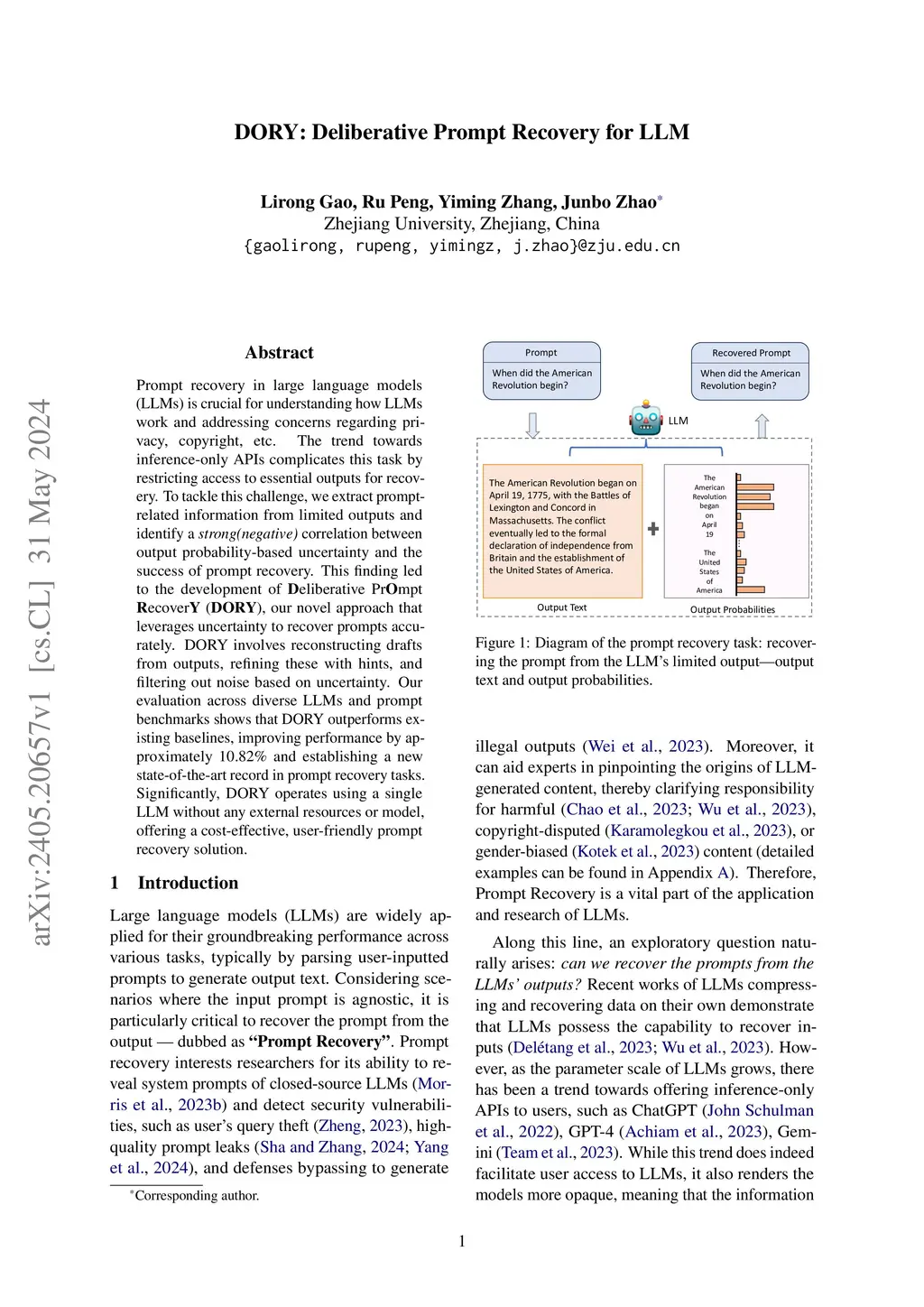 DORY: Deliberative Prompt Recovery for LLM