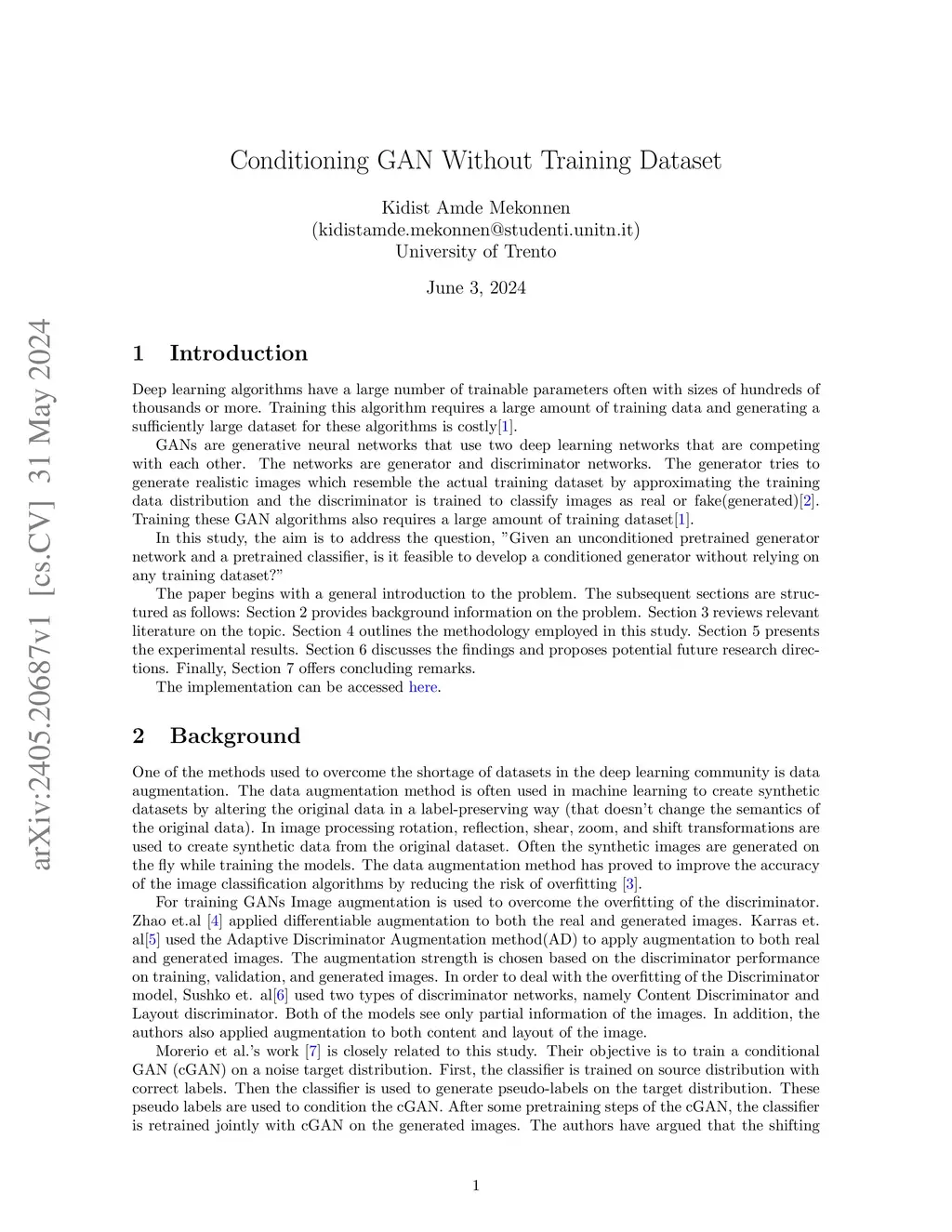 Deep learning algorithms have a large number of trainable parameters often with sizes of hundreds of thousands or more. Training this algorithm requires a large amount of training data and generating a sufficiently large dataset for these algorithms is costly\cite{noguchi2019image}. GANs are generative neural networks that use two deep learning networks that are competing with each other. The networks are generator and discriminator networks. The generator tries to generate realistic images which resemble the actual training dataset by approximating the training data distribution and the discriminator is trained to classify images as real or fake(generated)\cite{goodfellow2016nips}. Training these GAN algorithms also requires a large amount of training dataset\cite{noguchi2019image}. In this study, the aim is to address the question, "Given an unconditioned pretrained generator network and a pretrained classifier, is it feasible to develop a conditioned generator without relying on any training dataset?" The paper begins with a general introduction to the problem. The subsequent sections are structured as follows: Section 2 provides background information on the problem. Section 3 reviews relevant literature on the topic. Section 4 outlines the methodology employed in this study. Section 5 presents the experimental results. Section 6 discusses the findings and proposes potential future research directions. Finally, Section 7 offers concluding remarks. The implementation can be accessed \href{https://github.com/kidist-amde/BigGAN-PyTorch}{here}.