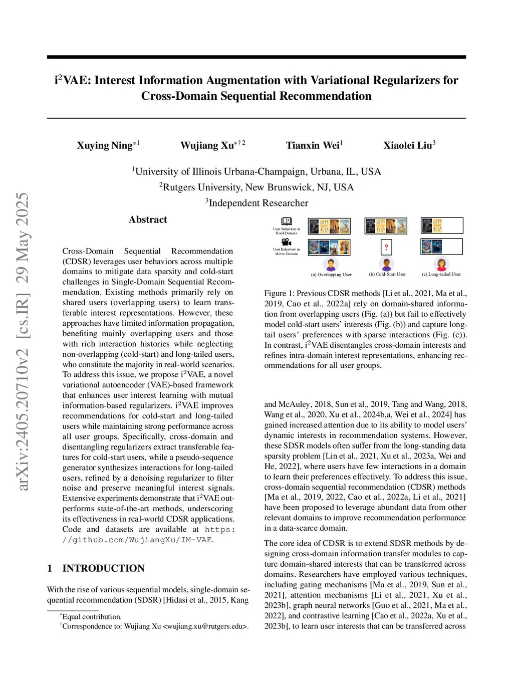 Cross-Domain Sequential Recommendation (CDSR) leverages user behaviors across multiple domains to mitigate data sparsity and cold-start challenges in Single-Domain Sequential Recommendation. Existing methods primarily rely on shared users (overlapping users) to learn transferable interest representations. However, these approaches have limited information propagation, benefiting mainly overlapping users and those with rich interaction histories while neglecting non-overlapping (cold-start) and long-tailed users, who constitute the majority in real-world scenarios. To address this issue, we propose iVAE, a novel variational autoencoder (VAE)-based framework that enhances user interest learning with mutual information-based regularizers. iVAE improves recommendations for cold-start and long-tailed users while maintaining strong performance across all user groups. Specifically, cross-domain and disentangling regularizers extract transferable features for cold-start users, while a pseudo-sequence generator synthesizes interactions for long-tailed users, refined by a denoising regularizer to filter noise and preserve meaningful interest signals. Extensive experiments demonstrate that iVAE outperforms state-of-the-art methods, underscoring its effectiveness in real-world CDSR applications.