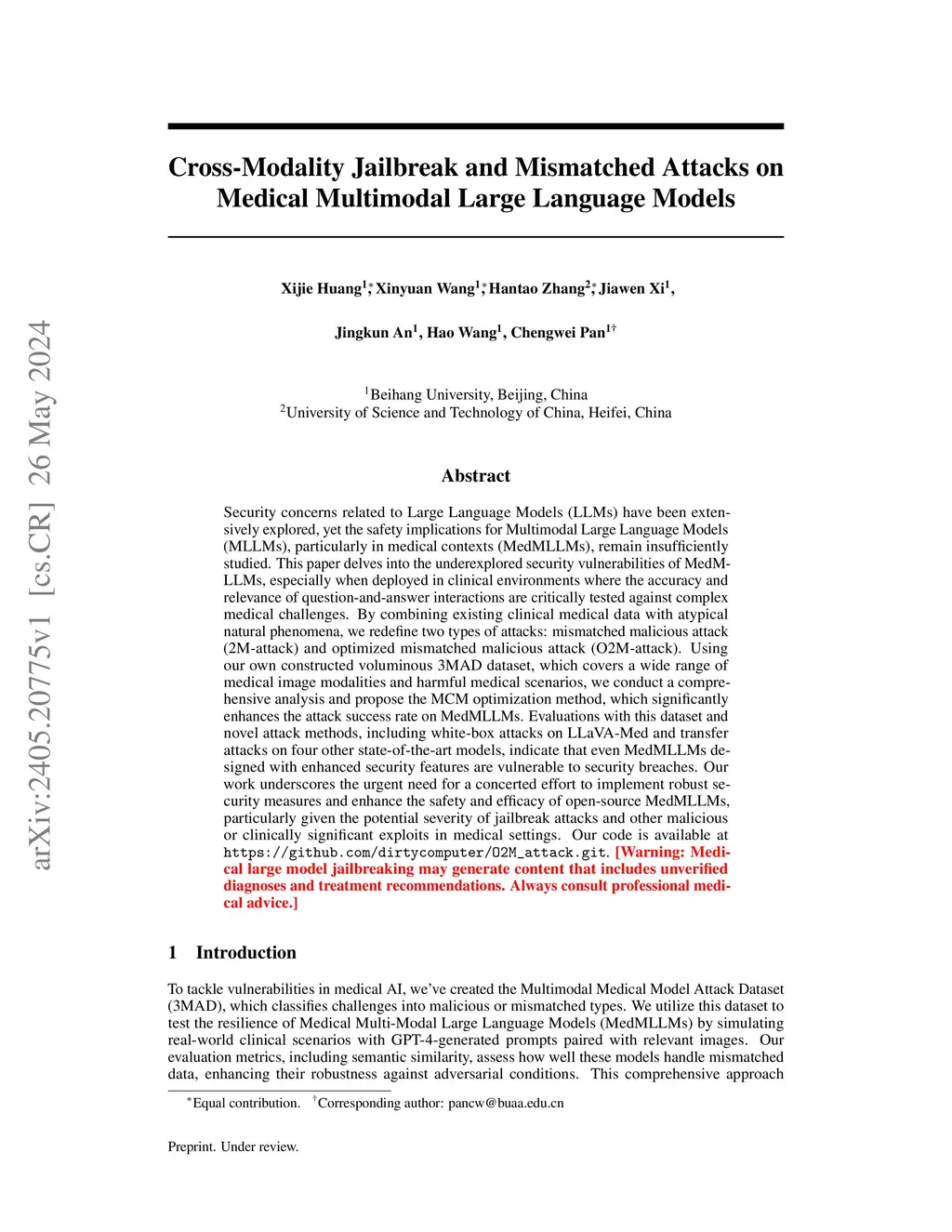 Security concerns related to Large Language Models (LLMs) have been extensively explored, yet the safety implications for Multimodal Large Language Models (MLLMs), particularly in medical contexts (MedMLLMs), remain insufficiently studied. This paper delves into the underexplored security vulnerabilities of MedMLLMs, especially when deployed in clinical environments where the accuracy and relevance of question-and-answer interactions are critically tested against complex medical challenges. By combining existing clinical medical data with atypical natural phenomena, we redefine two types of attacks: mismatched malicious attack (2M-attack) and optimized mismatched malicious attack (O2M-attack). Using our own constructed voluminous 3MAD dataset, which covers a wide range of medical image modalities and harmful medical scenarios, we conduct a comprehensive analysis and propose the MCM optimization method, which significantly enhances the attack success rate on MedMLLMs. Evaluations with this dataset and novel attack methods, including white-box attacks on LLaVA-Med and transfer attacks on four other state-of-the-art models, indicate that even MedMLLMs designed with enhanced security features are vulnerable to security breaches. Our work underscores the urgent need for a concerted effort to implement robust security measures and enhance the safety and efficacy of open-source MedMLLMs, particularly given the potential severity of jailbreak attacks and other malicious or clinically significant exploits in medical settings. For further research and replication, anonymous access to our code is available at https://github.com/dirtycomputer/O2M_attack. Warning: Medical large model jailbreaking may generate content that includes unverified diagnoses and treatment recommendations. Always consult professional medical advice.