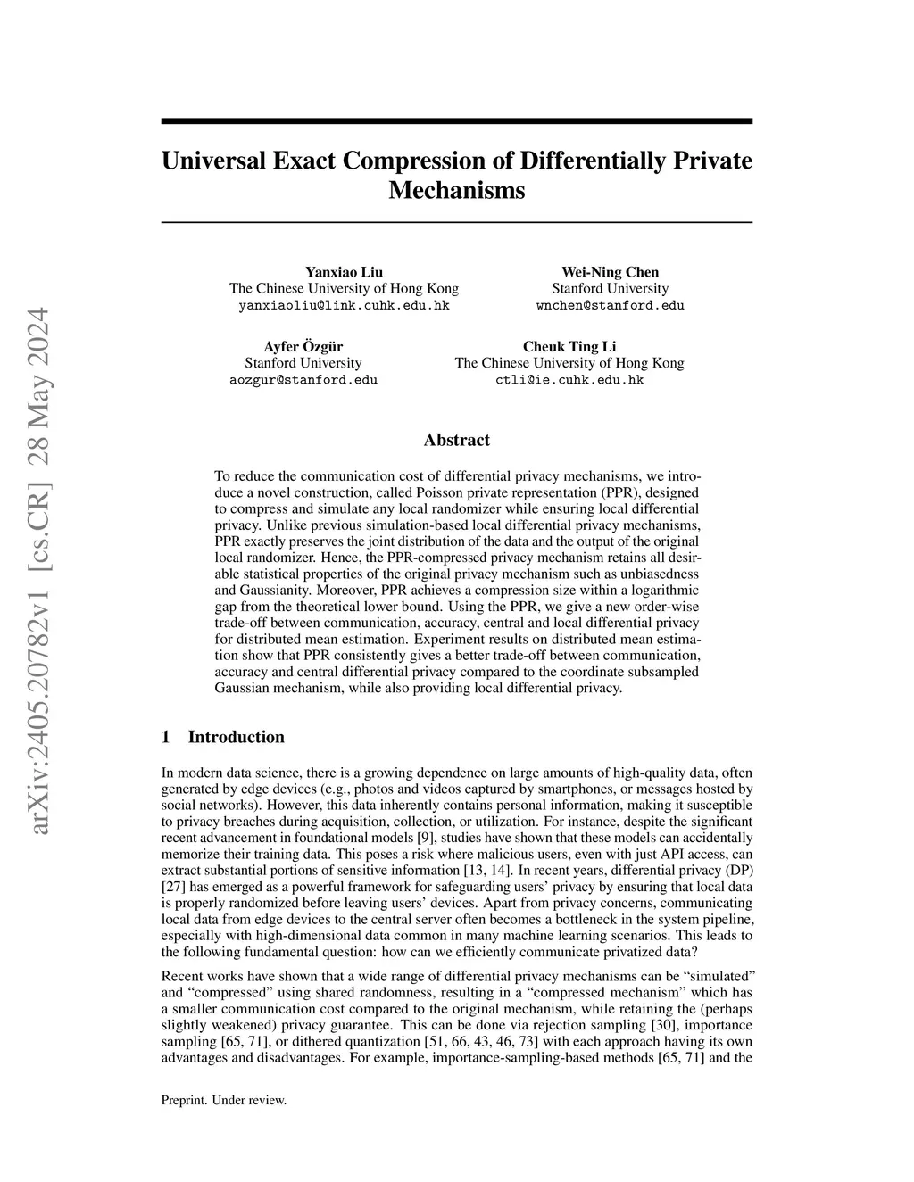 To reduce the communication cost of differential privacy mechanisms, we introduce a novel construction, called Poisson private representation (PPR), designed to compress and simulate any local randomizer while ensuring local differential privacy. Unlike previous simulation-based local differential privacy mechanisms, PPR exactly preserves the joint distribution of the data and the output of the original local randomizer. Hence, the PPR-compressed privacy mechanism retains all desirable statistical properties of the original privacy mechanism such as unbiasedness and Gaussianity. Moreover, PPR achieves a compression size within a logarithmic gap from the theoretical lower bound. Using the PPR, we give a new order-wise trade-off between communication, accuracy, central and local differential privacy for distributed mean estimation. Experiment results on distributed mean estimation show that PPR consistently gives a better trade-off between communication, accuracy and central differential privacy compared to the coordinate subsampled Gaussian mechanism, while also providing local differential privacy.