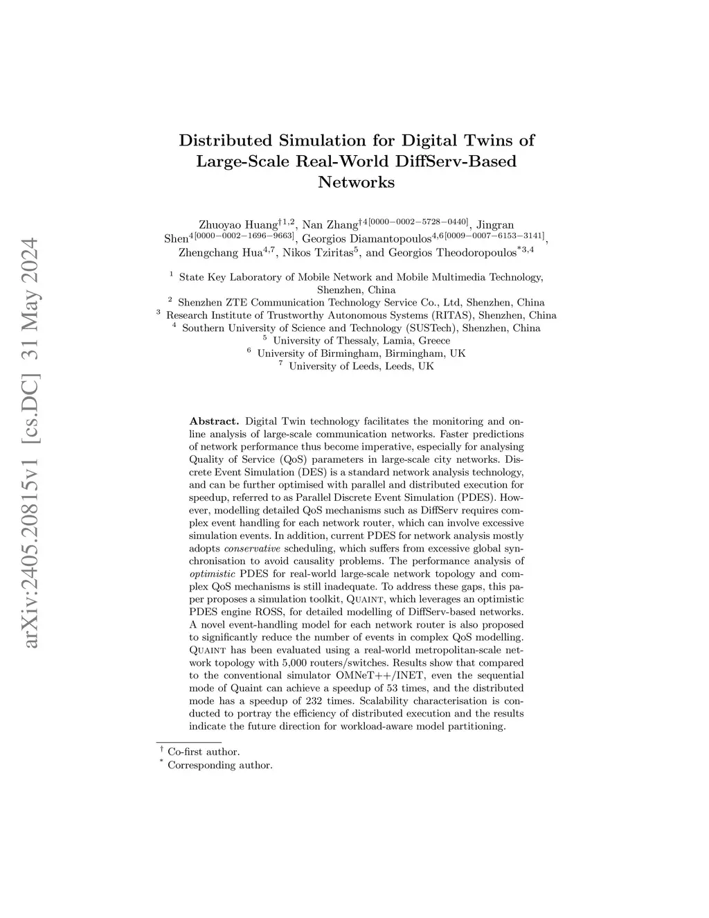 Digital Twin technology facilitates the monitoring and online analysis of large-scale communication networks. Faster predictions of network performance thus become imperative, especially for analysing Quality of Service (QoS) parameters in large-scale city networks. Discrete Event Simulation (DES) is a standard network analysis technology, and can be further optimised with parallel and distributed execution for speedup, referred to as Parallel Discrete Event Simulation (PDES). However, modelling detailed QoS mechanisms such as DiffServ requires complex event handling for each network router, which can involve excessive simulation events. In addition, current PDES for network analysis mostly adopts conservative scheduling, which suffers from excessive global synchronisation to avoid causality problems. The performance analysis of optimistic PDES for real-world large-scale network topology and complex QoS mechanisms is still inadequate. To address these gaps, this paper proposes a simulation toolkit, Quaint, which leverages an optimistic PDES engine ROSS, for detailed modelling of DiffServ-based networks. A novel event-handling model for each network router is also proposed to significantly reduce the number of events in complex QoS modelling. Quaint has been evaluated using a real-world metropolitan-scale network topology with 5,000 routers/switches. Results show that compared to the conventional simulator OMNeT++/INET, even the sequential mode of Quaint can achieve a speedup of 53 times, and the distributed mode has a speedup of 232 times. Scalability characterisation is conducted to portray the efficiency of distributed execution, and the results indicate the future direction for workload-aware model partitioning.