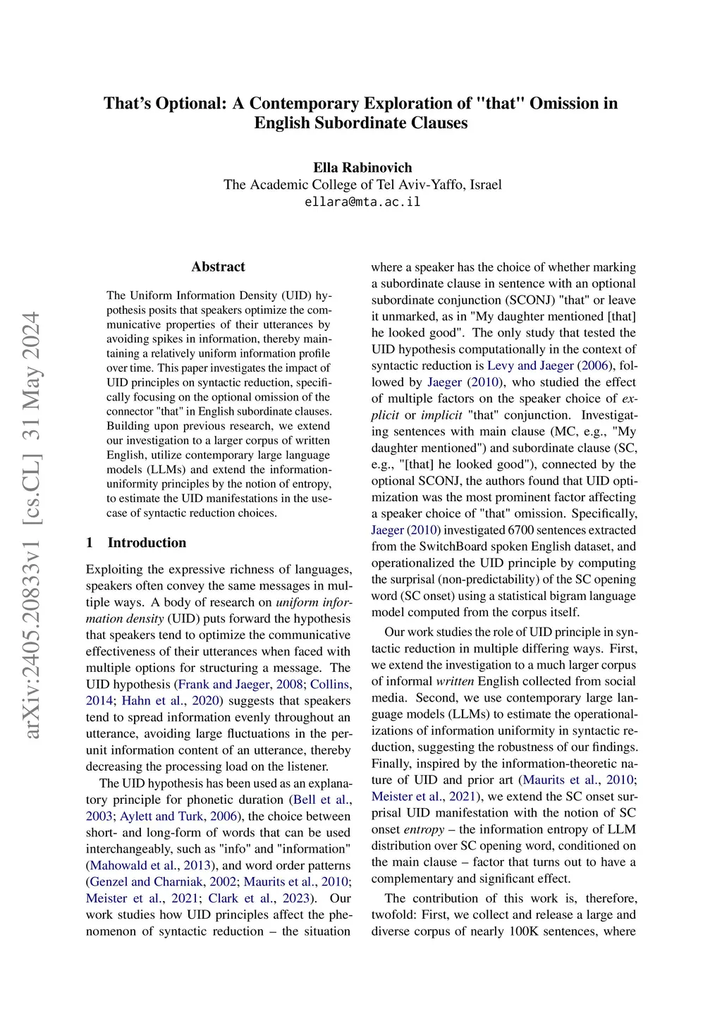 The Uniform Information Density (UID) hypothesis posits that speakers optimize the communicative properties of their utterances by avoiding spikes in information, thereby maintaining a relatively uniform information profile over time. This paper investigates the impact of UID principles on syntactic reduction, specifically focusing on the optional omission of the connector "that" in English subordinate clauses. Building upon previous research, we extend our investigation to a larger corpus of written English, utilize contemporary large language models (LLMs) and extend the information-uniformity principles by the notion of entropy, to estimate the UID manifestations in the usecase of syntactic reduction choices.