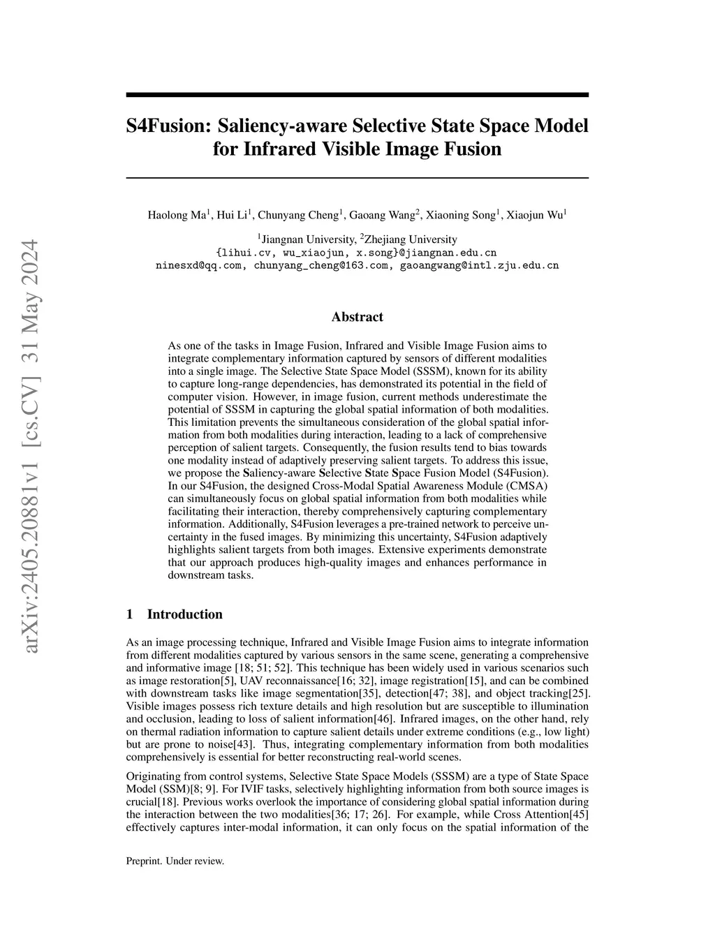 As one of the tasks in Image Fusion, Infrared and Visible Image Fusion aims to integrate complementary information captured by sensors of different modalities into a single image. The Selective State Space Model (SSSM), known for its ability to capture long-range dependencies, has demonstrated its potential in the field of computer vision. However, in image fusion, current methods underestimate the potential of SSSM in capturing the global spatial information of both modalities. This limitation prevents the simultaneous consideration of the global spatial information from both modalities during interaction, leading to a lack of comprehensive perception of salient targets. Consequently, the fusion results tend to bias towards one modality instead of adaptively preserving salient targets. To address this issue, we propose the Saliency-aware Selective State Space Fusion Model (S4Fusion). In our S4Fusion, the designed Cross-Modal Spatial Awareness Module (CMSA) can simultaneously focus on global spatial information from both modalities while facilitating their interaction, thereby comprehensively capturing complementary information. Additionally, S4Fusion leverages a pre-trained network to perceive uncertainty in the fused images. By minimizing this uncertainty, S4Fusion adaptively highlights salient targets from both images. Extensive experiments demonstrate that our approach produces high-quality images and enhances performance in downstream tasks.