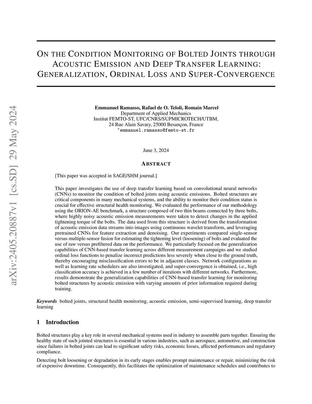 This paper investigates the use of deep transfer learning based on convolutional neural networks (CNNs) to monitor the condition of bolted joints using acoustic emissions. Bolted structures are critical components in many mechanical systems, and the ability to monitor their condition status is crucial for effective structural health monitoring. We evaluated the performance of our methodology using the ORION-AE benchmark, a structure composed of two thin beams connected by three bolts, where highly noisy acoustic emission measurements were taken to detect changes in the applied tightening torque of the bolts. The data used from this structure is derived from the transformation of acoustic emission data streams into images using continuous wavelet transform, and leveraging pretrained CNNs for feature extraction and denoising. Our experiments compared single-sensor versus multiple-sensor fusion for estimating the tightening level (loosening) of bolts and evaluated the use of raw versus prefiltered data on the performance. We particularly focused on the generalization capabilities of CNN-based transfer learning across different measurement campaigns and we studied ordinal loss functions to penalize incorrect predictions less severely when close to the ground truth, thereby encouraging misclassification errors to be in adjacent classes. Network configurations as well as learning rate schedulers are also investigated, and super-convergence is obtained, i.e., high classification accuracy is achieved in a few number of iterations with different networks. Furthermore, results demonstrate the generalization capabilities of CNN-based transfer learning for monitoring bolted structures by acoustic emission with varying amounts of prior information required during training.