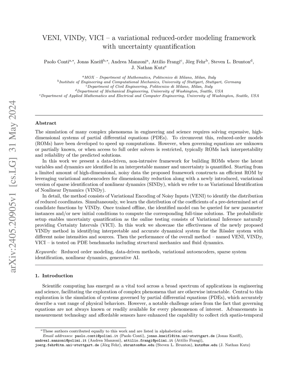 The simulation of many complex phenomena in engineering and science requires solving expensive, high-dimensional systems of partial differential equations (PDEs). To circumvent this, reduced-order models (ROMs) have been developed to speed up computations. However, when governing equations are unknown or partially known, typically ROMs lack interpretability and reliability of the predicted solutions.In this work we present a data-driven, non-intrusive framework for building ROMs where the latent variables and dynamics are identified in an interpretable manner and uncertainty is quantified. Starting from a limited amount of high-dimensional, noisy data the proposed framework constructs an efficient ROM by leveraging variational autoencoders for dimensionality reduction along with a newly introduced, variational version of sparse identification of nonlinear dynamics (SINDy), which we refer to as Variational Identification of Nonlinear Dynamics (VINDy).In detail, the method consists of Variational Encoding of Noisy Inputs (VENI) to identify the distribution of reduced coordinates. Simultaneously, we learn the distribution of the coefficients of a pre-determined set of candidate functions by VINDy. Once trained offline, the identified model can be queried for new parameter instances and new initial conditions to compute the corresponding full-time solutions. The probabilistic setup enables uncertainty quantification as the online testing consists of Variational Inference naturally providing Certainty Intervals (VICI). In this work we showcase the effectiveness of the newly proposed VINDy method in identifying interpretable and accurate dynamical system for the Roessler system with different noise intensities and sources. Then the performance of the overall method - named VENI, VINDy, VICI - is tested on PDE benchmarks including structural mechanics and fluid dynamics.