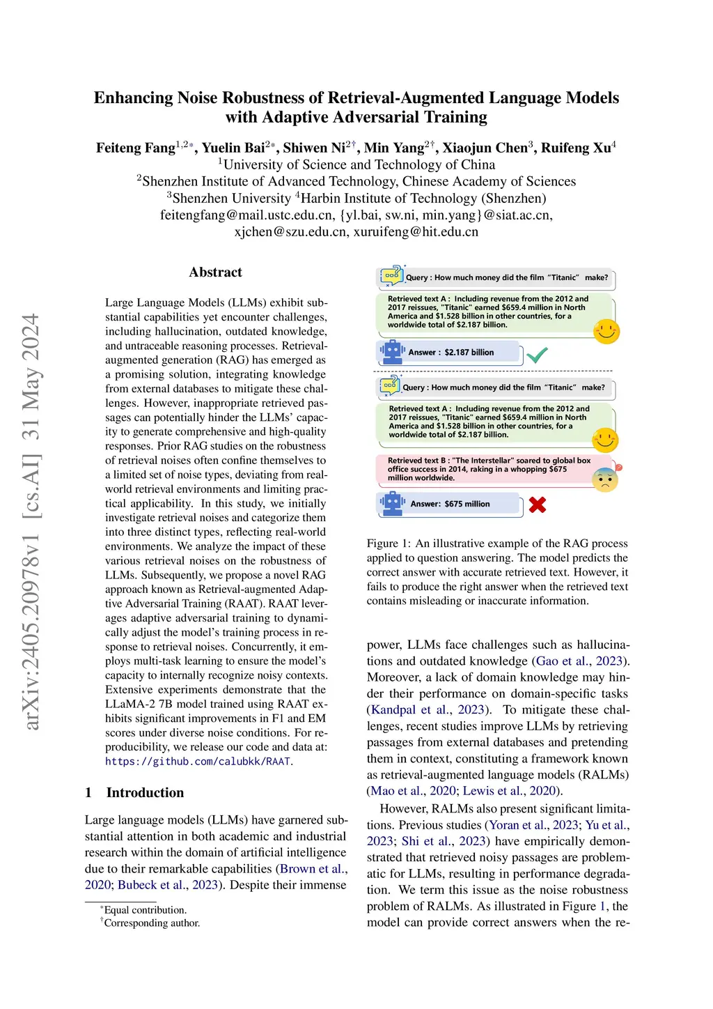 Large Language Models (LLMs) exhibit substantial capabilities yet encounter challenges, including hallucination, outdated knowledge, and untraceable reasoning processes. Retrieval-augmented generation (RAG) has emerged as a promising solution, integrating knowledge from external databases to mitigate these challenges. However, inappropriate retrieved passages can potentially hinder the LLMs' capacity to generate comprehensive and high-quality responses. Prior RAG studies on the robustness of retrieval noises often confine themselves to a limited set of noise types, deviating from real-world retrieval environments and limiting practical applicability. In this study, we initially investigate retrieval noises and categorize them into three distinct types, reflecting real-world environments. We analyze the impact of these various retrieval noises on the robustness of LLMs. Subsequently, we propose a novel RAG approach known as Retrieval-augmented Adaptive Adversarial Training (RAAT). RAAT leverages adaptive adversarial training to dynamically adjust the model's training process in response to retrieval noises. Concurrently, it employs multi-task learning to ensure the model's capacity to internally recognize noisy contexts. Extensive experiments demonstrate that the LLaMA-2 7B model trained using RAAT exhibits significant improvements in F1 and EM scores under diverse noise conditions. For reproducibility, we release our code and data at: https://github.com/calubkk/RAAT.