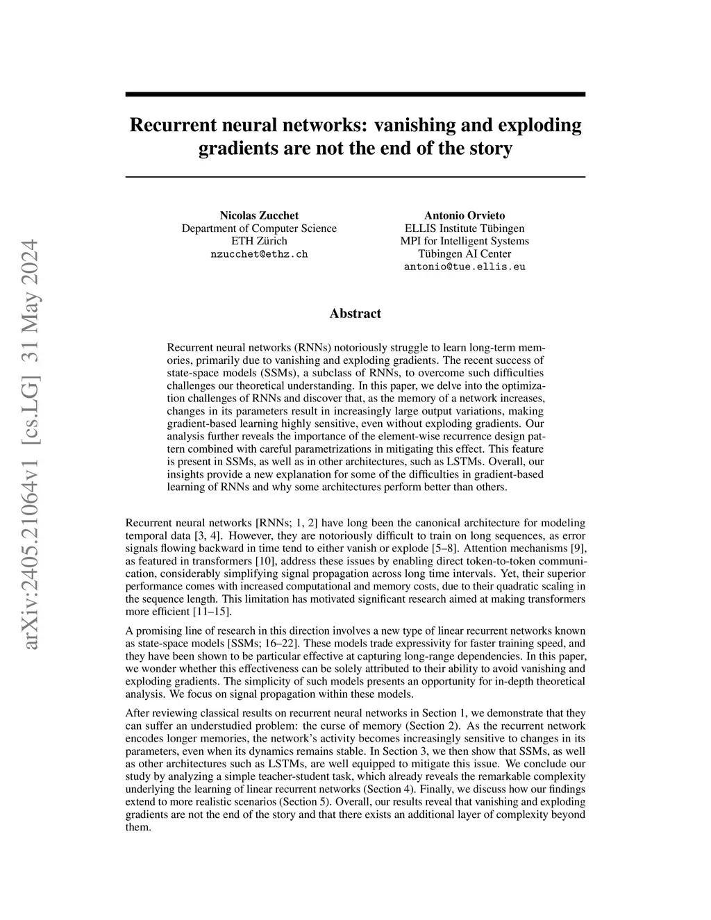 Recurrent neural networks (RNNs) notoriously struggle to learn long-term memories, primarily due to vanishing and exploding gradients. The recent success of state-space models (SSMs), a subclass of RNNs, to overcome such difficulties challenges our theoretical understanding. In this paper, we delve into the optimization challenges of RNNs and discover that, as the memory of a network increases, changes in its parameters result in increasingly large output variations, making gradient-based learning highly sensitive, even without exploding gradients. Our analysis further reveals the importance of the element-wise recurrence design pattern combined with careful parametrizations in mitigating this effect. This feature is present in SSMs, as well as in other architectures, such as LSTMs. Overall, our insights provide a new explanation for some of the difficulties in gradient-based learning of RNNs and why some architectures perform better than others.
