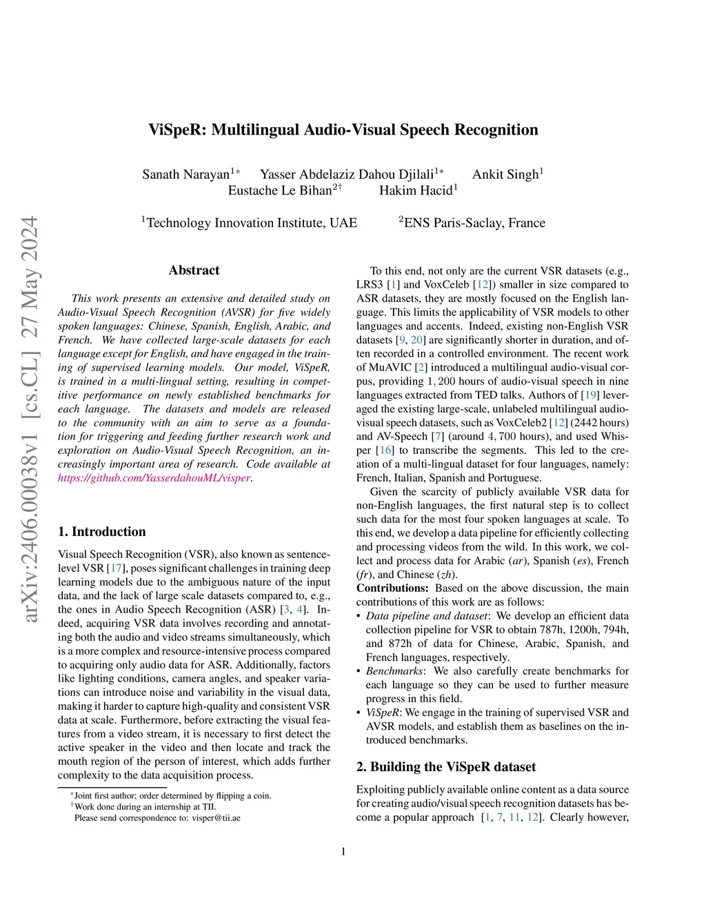 This work presents an extensive and detailed study on Audio-Visual Speech Recognition (AVSR) for five widely spoken languages: Chinese, Spanish, English, Arabic, and French. We have collected large-scale datasets for each language except for English, and have engaged in the training of supervised learning models. Our model, ViSpeR, is trained in a multi-lingual setting, resulting in competitive performance on newly established benchmarks for each language. The datasets and models are released to the community with an aim to serve as a foundation for triggering and feeding further research work and exploration on Audio-Visual Speech Recognition, an increasingly important area of research. Code available at \href{https://github.com/YasserdahouML/visper}{https://github.com/YasserdahouML/visper}.