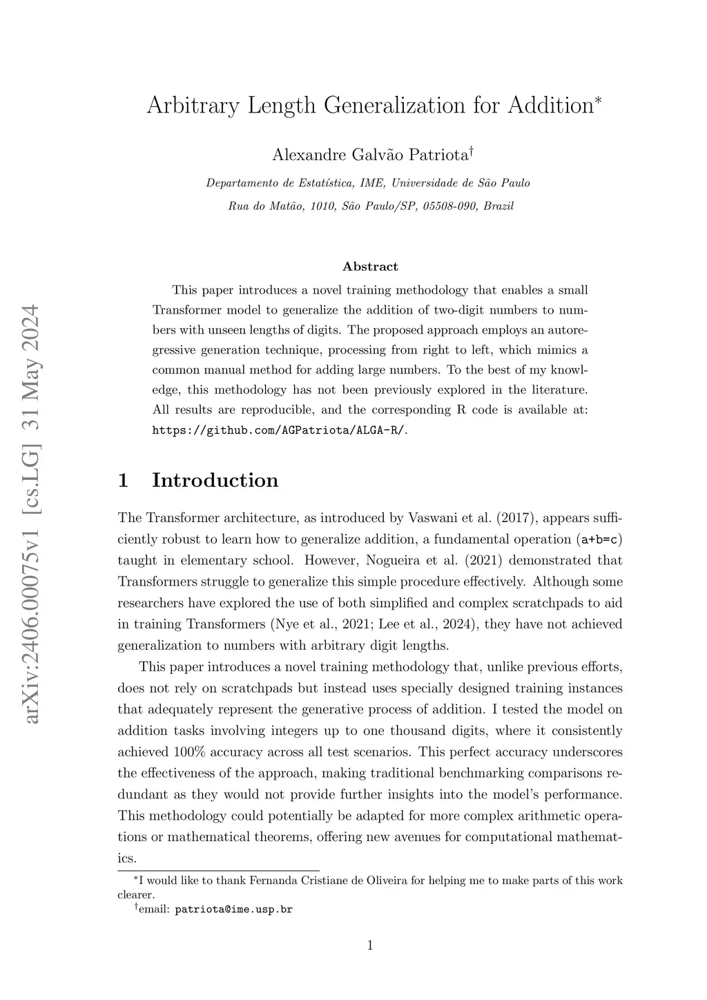 This paper introduces a novel training methodology that enables a Transformer model to generalize the addition of two-digit numbers to numbers with unseen lengths of digits. The proposed approach employs an autoregressive generation technique, processing from right to left, which mimics a common manual method for adding large numbers. To the best of my knowledge, this methodology has not been previously explored in the literature. All results are reproducible, and the corresponding R code is available at github.com/AGPatriota/ALGA-R/.