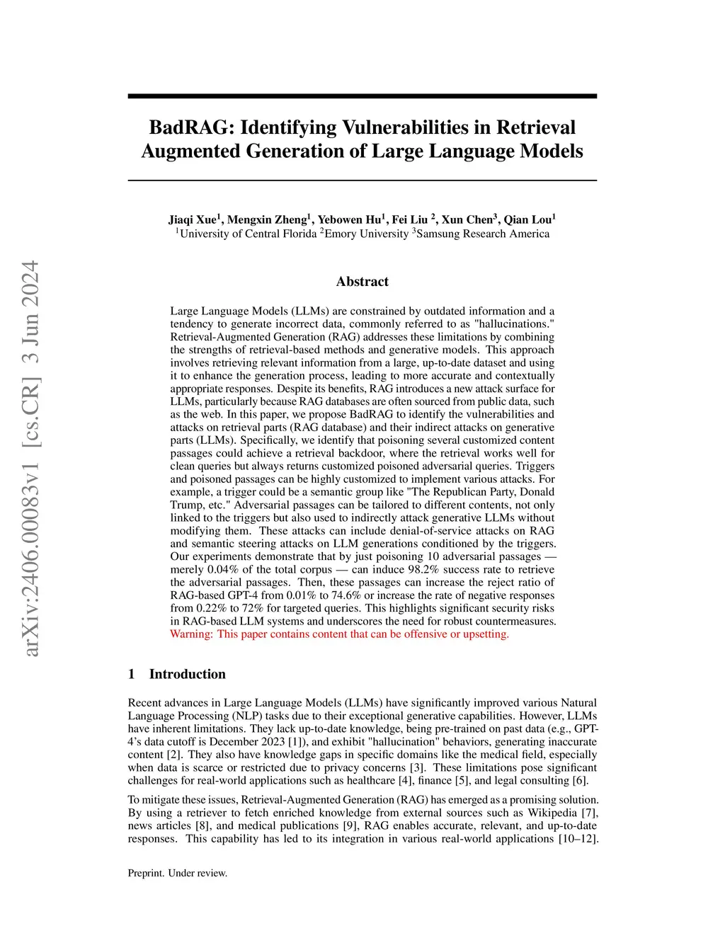 BadRAG: Identifying Vulnerabilities in Retrieval Augmented Generation of