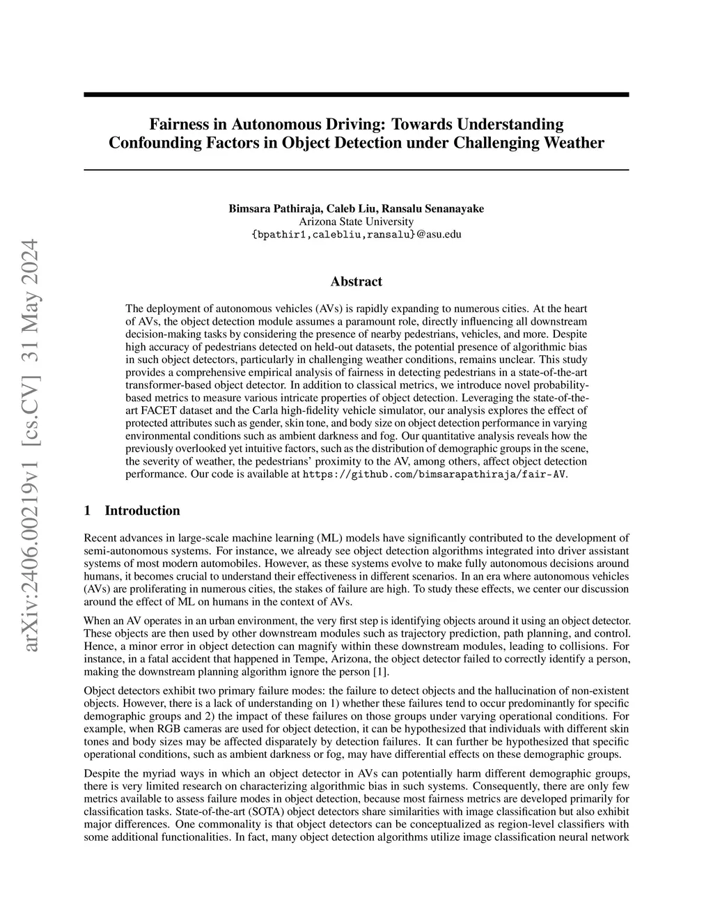 The deployment of autonomous vehicles (AVs) is rapidly expanding to numerous cities. At the heart of AVs, the object detection module assumes a paramount role, directly influencing all downstream decision-making tasks by considering the presence of nearby pedestrians, vehicles, and more. Despite high accuracy of pedestrians detected on held-out datasets, the potential presence of algorithmic bias in such object detectors, particularly in challenging weather conditions, remains unclear. This study provides a comprehensive empirical analysis of fairness in detecting pedestrians in a state-of-the-art transformer-based object detector. In addition to classical metrics, we introduce novel probability-based metrics to measure various intricate properties of object detection. Leveraging the state-of-the-art FACET dataset and the Carla high-fidelity vehicle simulator, our analysis explores the effect of protected attributes such as gender, skin tone, and body size on object detection performance in varying environmental conditions such as ambient darkness and fog. Our quantitative analysis reveals how the previously overlooked yet intuitive factors, such as the distribution of demographic groups in the scene, the severity of weather, the pedestrians' proximity to the AV, among others, affect object detection performance. Our code is available at https://github.com/bimsarapathiraja/fair-AV.