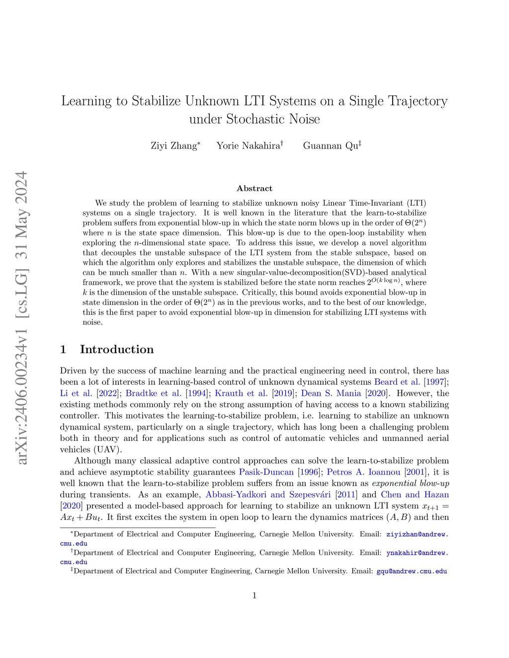 We study the problem of learning to stabilize unknown noisy Linear Time-Invariant (LTI) systems on a single trajectory. It is well known in the literature that the learn-to-stabilize problem suffers from exponential blow-up in which the state norm blows up in the order of where is the state space dimension. This blow-up is due to the open-loop instability when exploring the -dimensional state space. To address this issue, we develop a novel algorithm that decouples the unstable subspace of the LTI system from the stable subspace, based on which the algorithm only explores and stabilizes the unstable subspace, the dimension of which can be much smaller than . With a new singular-value-decomposition(SVD)-based analytical framework, we prove that the system is stabilized before the state norm reaches , where is the dimension of the unstable subspace. Critically, this bound avoids exponential blow-up in state dimension in the order of as in the previous works, and to the best of our knowledge, this is the first paper to avoid exponential blow-up in dimension for stabilizing LTI systems with noise.