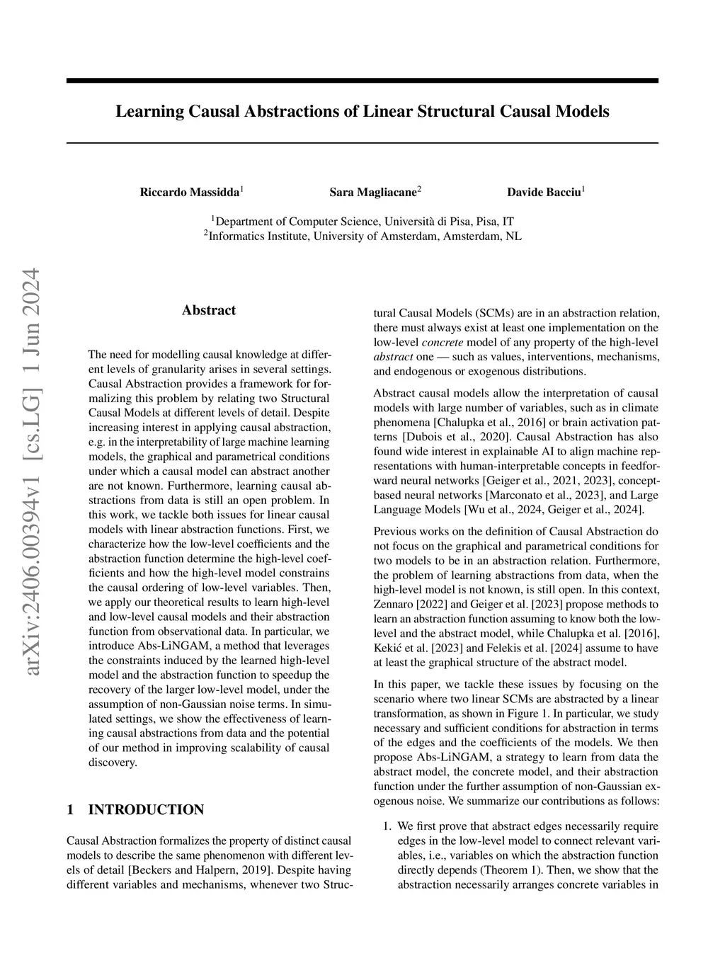 The need for modelling causal knowledge at different levels of granularity arises in several settings. Causal Abstraction provides a framework for formalizing this problem by relating two Structural Causal Models at different levels of detail. Despite increasing interest in applying causal abstraction, e.g. in the interpretability of large machine learning models, the graphical and parametrical conditions under which a causal model can abstract another are not known. Furthermore, learning causal abstractions from data is still an open problem. In this work, we tackle both issues for linear causal models with linear abstraction functions. First, we characterize how the low-level coefficients and the abstraction function determine the high-level coefficients and how the high-level model constrains the causal ordering of low-level variables. Then, we apply our theoretical results to learn high-level and low-level causal models and their abstraction function from observational data. In particular, we introduce Abs-LiNGAM, a method that leverages the constraints induced by the learned high-level model and the abstraction function to speedup the recovery of the larger low-level model, under the assumption of non-Gaussian noise terms. In simulated settings, we show the effectiveness of learning causal abstractions from data and the potential of our method in improving scalability of causal discovery.