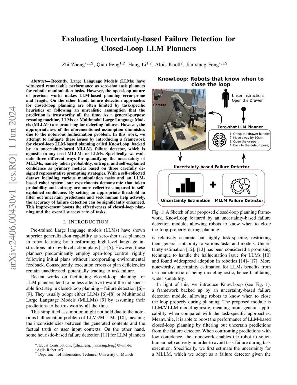 Recently, Large Language Models (LLMs) have witnessed remarkable performance as zero-shot task planners for robotic manipulation tasks. However, the open-loop nature of previous works makes LLM-based planning error-prone and fragile. On the other hand, failure detection approaches for closed-loop planning are often limited by task-specific heuristics or following an unrealistic assumption that the prediction is trustworthy all the time. As a general-purpose reasoning machine, LLMs or Multimodal Large Language Models (MLLMs) are promising for detecting failures. However, However, the appropriateness of the aforementioned assumption diminishes due to the notorious hullucination problem. In this work, we attempt to mitigate these issues by introducing a framework for closed-loop LLM-based planning called KnowLoop, backed by an uncertainty-based MLLMs failure detector, which is agnostic to any used MLLMs or LLMs. Specifically, we evaluate three different ways for quantifying the uncertainty of MLLMs, namely token probability, entropy, and self-explained confidence as primary metrics based on three carefully designed representative prompting strategies. With a self-collected dataset including various manipulation tasks and an LLM-based robot system, our experiments demonstrate that token probability and entropy are more reflective compared to self-explained confidence. By setting an appropriate threshold to filter out uncertain predictions and seek human help actively, the accuracy of failure detection can be significantly enhanced. This improvement boosts the effectiveness of closed-loop planning and the overall success rate of tasks.