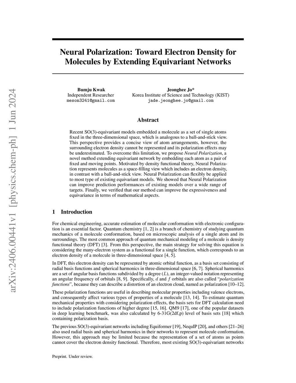 Recent SO(3)-equivariant models embedded a molecule as a set of single atoms fixed in the three-dimensional space, which is analogous to a ball-and-stick view. This perspective provides a concise view of atom arrangements, however, the surrounding electron density cannot be represented and its polarization effects may be underestimated. To overcome this limitation, we propose \textit{Neural Polarization}, a novel method extending equivariant network by embedding each atom as a pair of fixed and moving points. Motivated by density functional theory, Neural Polarization represents molecules as a space-filling view which includes an electron density, in contrast with a ball-and-stick view. Neural Polarization can flexibly be applied to most type of existing equivariant models. We showed that Neural Polarization can improve prediction performances of existing models over a wide range of targets. Finally, we verified that our method can improve the expressiveness and equivariance in terms of mathematical aspects.