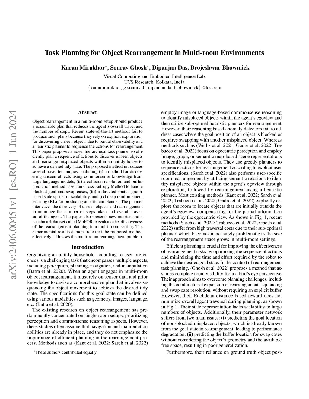 Object rearrangement in a multi-room setup should produce a reasonable plan that reduces the agent's overall travel and the number of steps. Recent state-of-the-art methods fail to produce such plans because they rely on explicit exploration for discovering unseen objects due to partial observability and a heuristic planner to sequence the actions for rearrangement. This paper proposes a novel hierarchical task planner to efficiently plan a sequence of actions to discover unseen objects and rearrange misplaced objects within an untidy house to achieve a desired tidy state. The proposed method introduces several novel techniques, including (i) a method for discovering unseen objects using commonsense knowledge from large language models, (ii) a collision resolution and buffer prediction method based on Cross-Entropy Method to handle blocked goal and swap cases, (iii) a directed spatial graph-based state space for scalability, and (iv) deep reinforcement learning (RL) for producing an efficient planner. The planner interleaves the discovery of unseen objects and rearrangement to minimize the number of steps taken and overall traversal of the agent. The paper also presents new metrics and a benchmark dataset called MoPOR to evaluate the effectiveness of the rearrangement planning in a multi-room setting. The experimental results demonstrate that the proposed method effectively addresses the multi-room rearrangement problem.